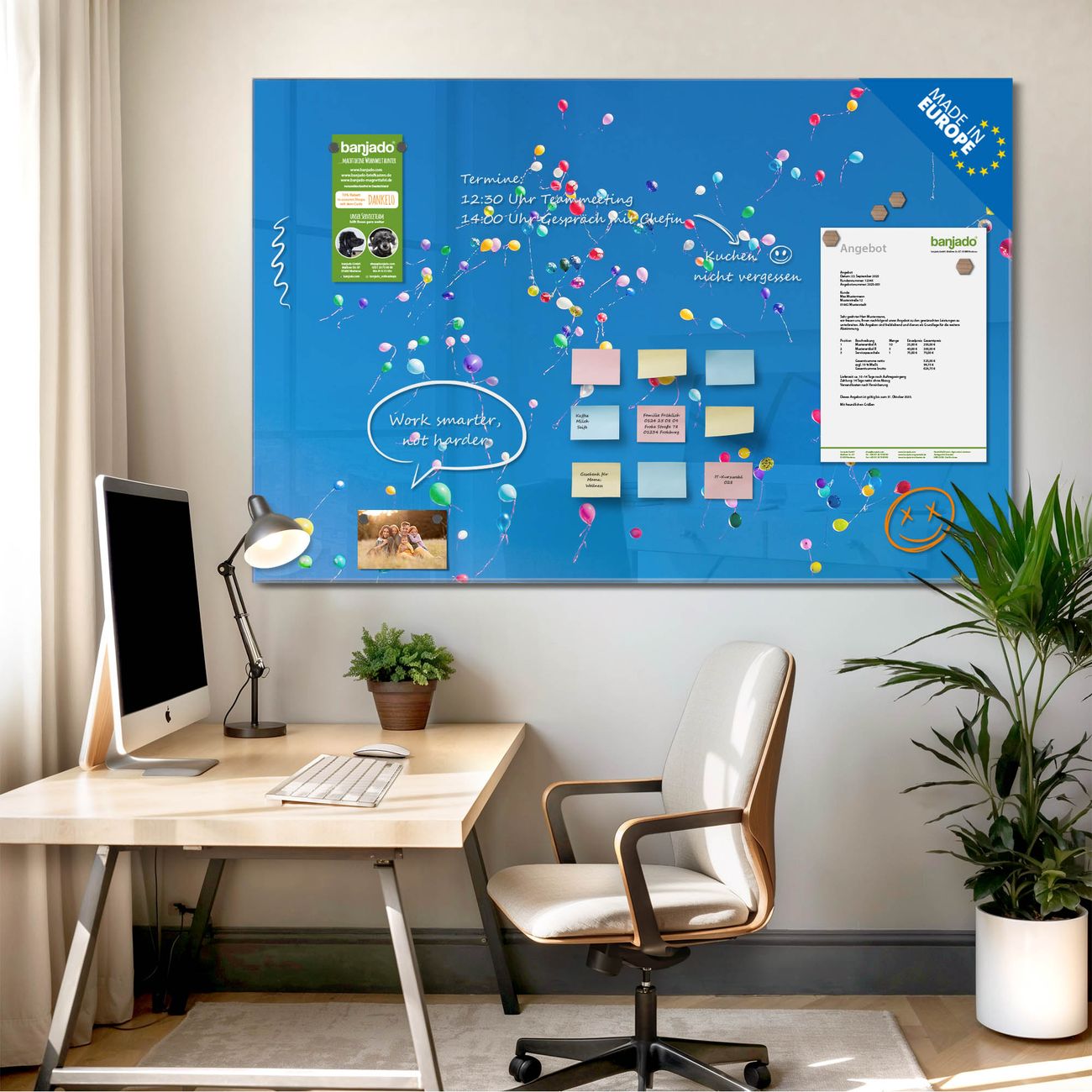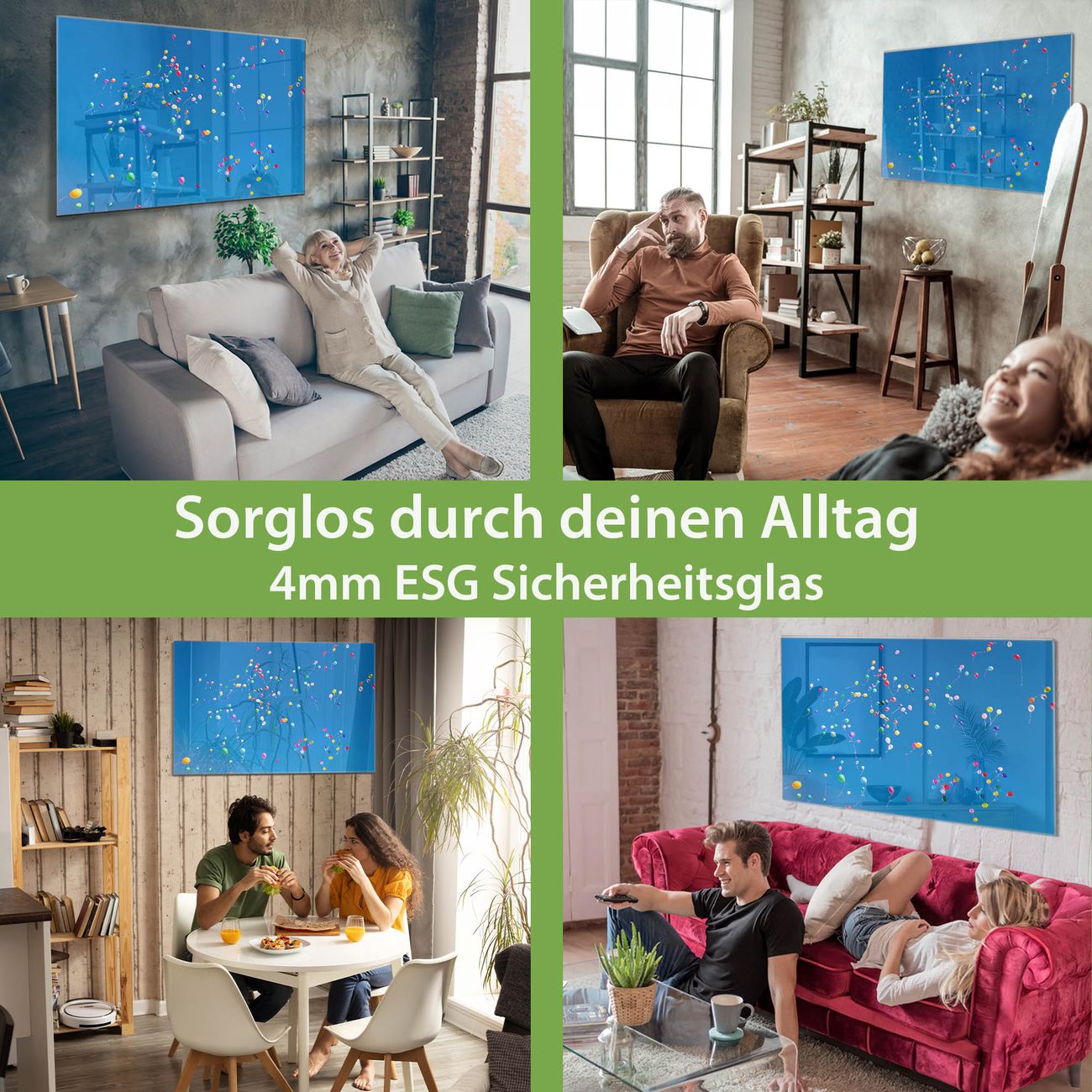 Material: 4mm Sicherheitsglas mit Metallrückwand Eigenschaften: beschreibbar, magnetisch, kratzfest Maße: 75x50x0,6cm, 5,63kg schwer Motiv Nummer 12505 Bunte Luftballons Zubehör: inklusive 4 Neodym-Magnete
