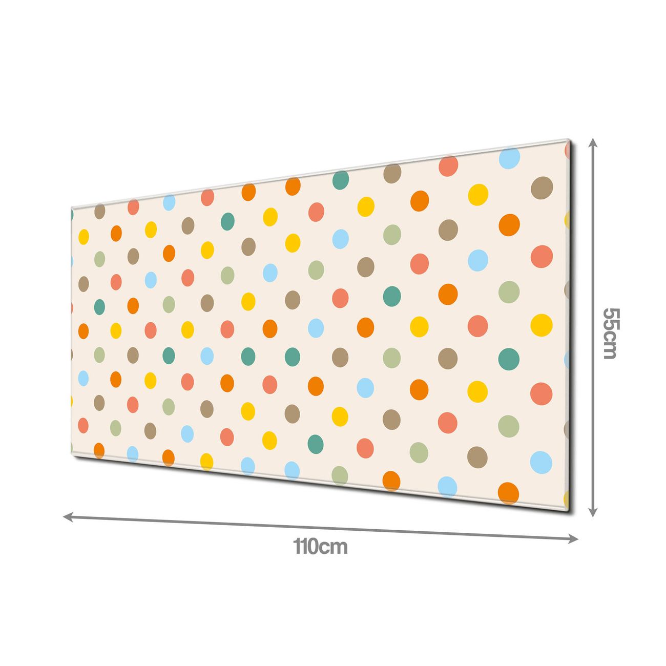 Material: 4mm Sicherheitsglas mit Metallrückwand Eigenschaften: beschreibbar, magnetisch, kratzfest Maße: 110x55x0,6cm, 9,08kg schwer Motiv Nummer 11360 Bunte Punkte Zubehör: inklusive 4 Neodym-Magnete