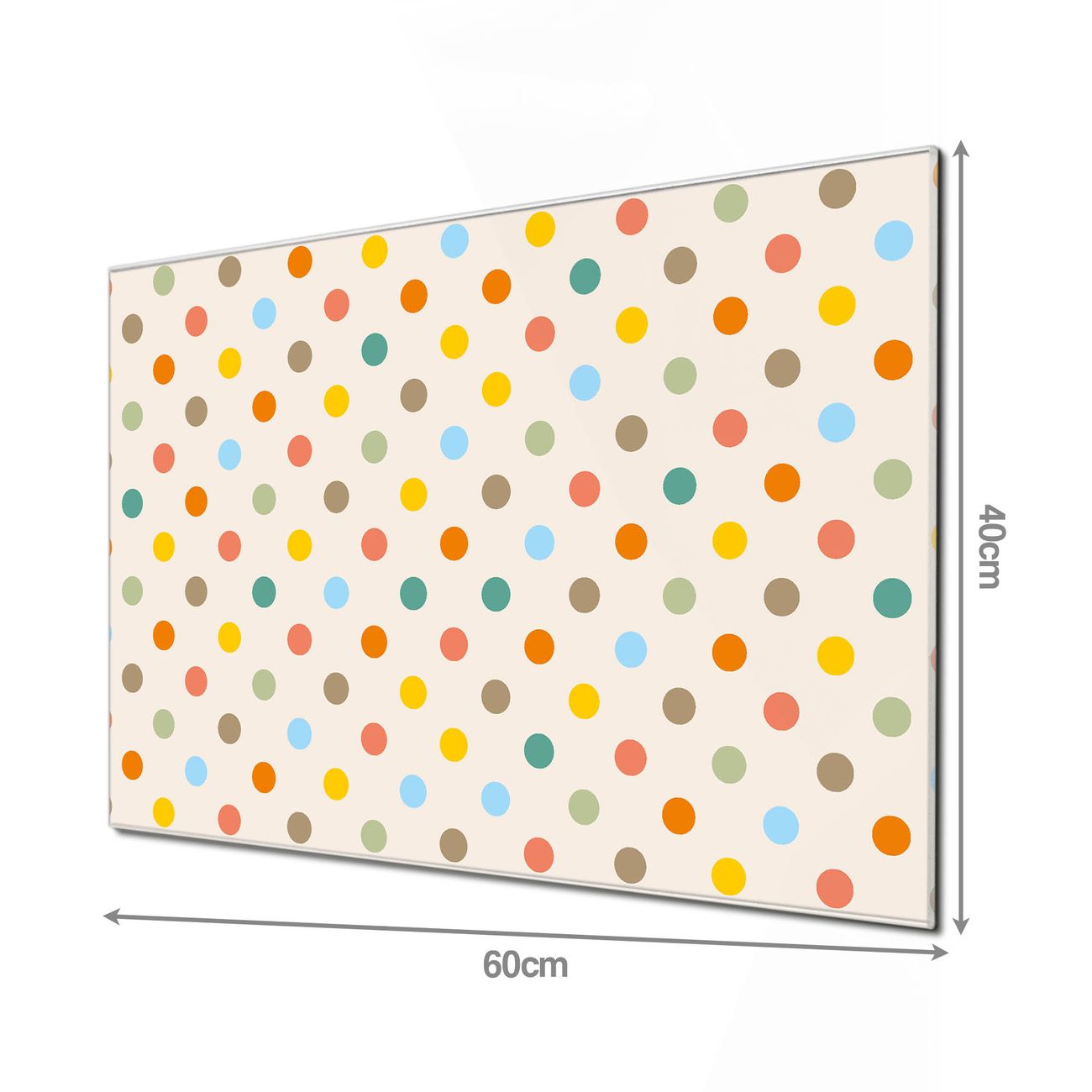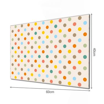 Material  4mm Sicherheitsglas mit Metallrückwand Eigenschaften  beschreibbar, magnetisch, kratzfest Maße  60x40x0,6cm, 3,6kg schwer Motiv  Nummer 11360 Bunte Punkte Zubehör  inklusive 4 Neodym-Magnete