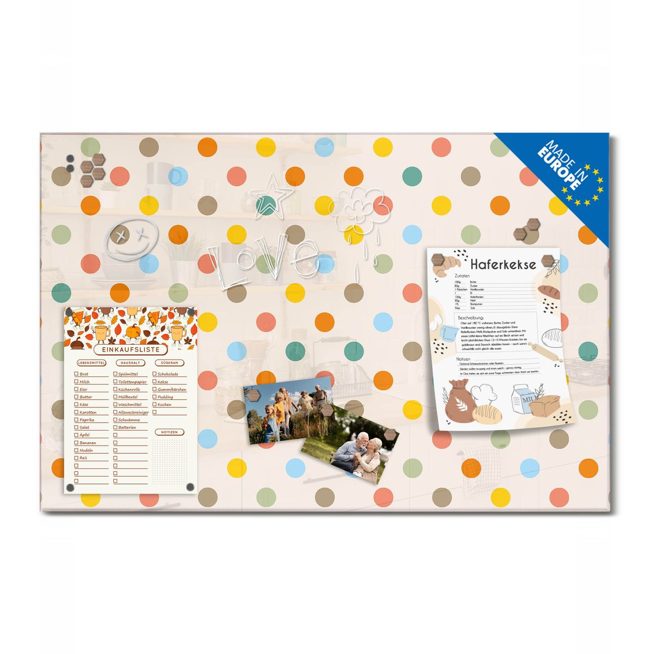 Ein Stück Design, das Ihren Alltag organisiert. Schreiben, heften, inspirieren - alles an einem Ort. Qualität, die man spürt. Montage leicht gemacht. Handwerk mit Herz - veredelt in Sachsen. Einzigartiges Design mit Motiv Motiv Bunte Punkte Beschreibbare Glasoberfläche, leicht zu reinigen Starke Magnetkraft durch Stahlrückwand Inklusive 4 Neodym-Magneten Flexible Montageoptionen Handveredelt in Sachsen - Qualität, die bleibt