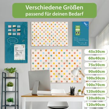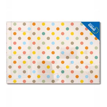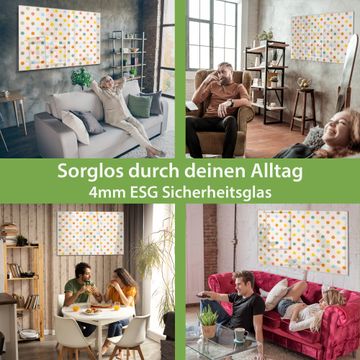 Material: 4mm Sicherheitsglas mit Metallrückwand Eigenschaften: beschreibbar, magnetisch, kratzfest Maße: 75x50x0,6cm, 5,63kg schwer Motiv Nummer 11360 Bunte Punkte Zubehör: inklusive 4 Neodym-Magnete