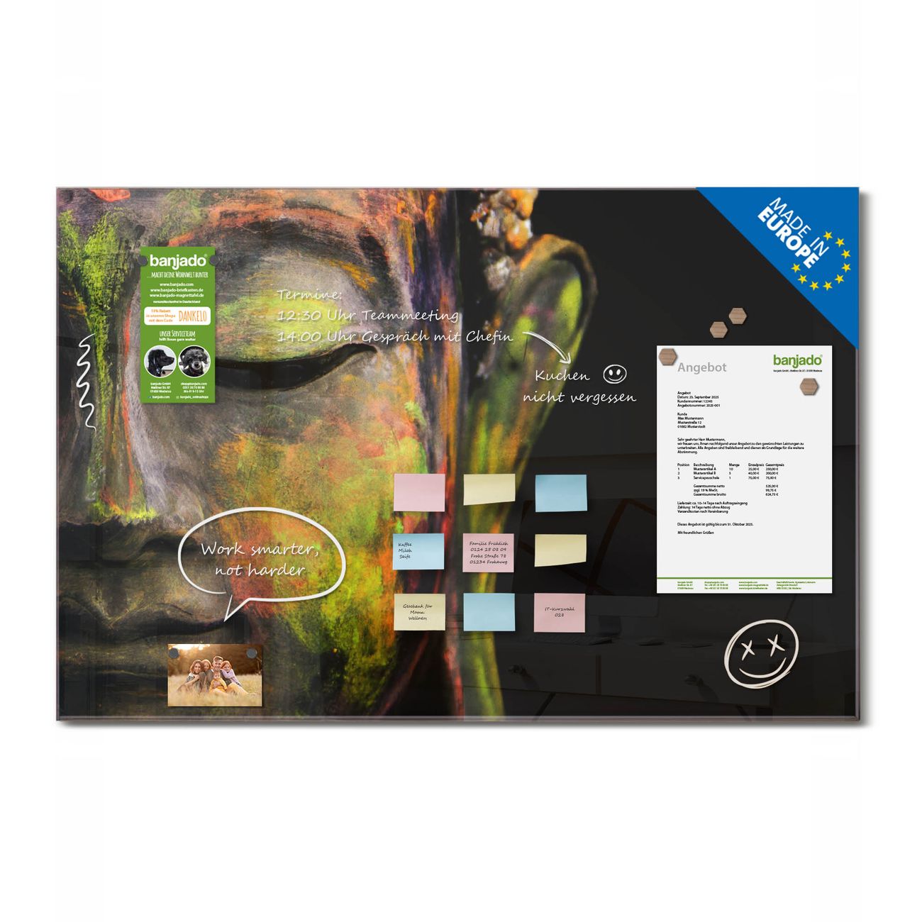 Material: 4mm Sicherheitsglas mit Metallrückwand Eigenschaften: beschreibbar, magnetisch, kratzfest Maße: 120x80x0,6cm, 14,40kg schwer Motiv Nummer 12103 Bunter Buddha Zubehör: inklusive 4 Neodym-Magnete