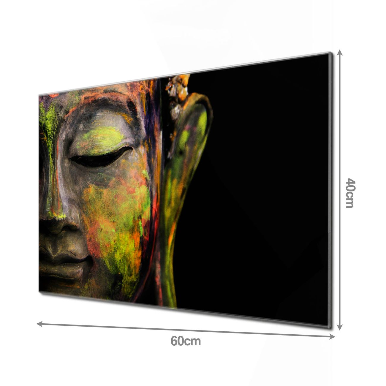Material  4mm Sicherheitsglas mit Metallrückwand Eigenschaften  beschreibbar, magnetisch, kratzfest Maße  60x40x0,6cm, 3,6kg schwer Motiv  Nummer 12103 Bunter Buddha Zubehör  inklusive 4 Neodym-Magnete