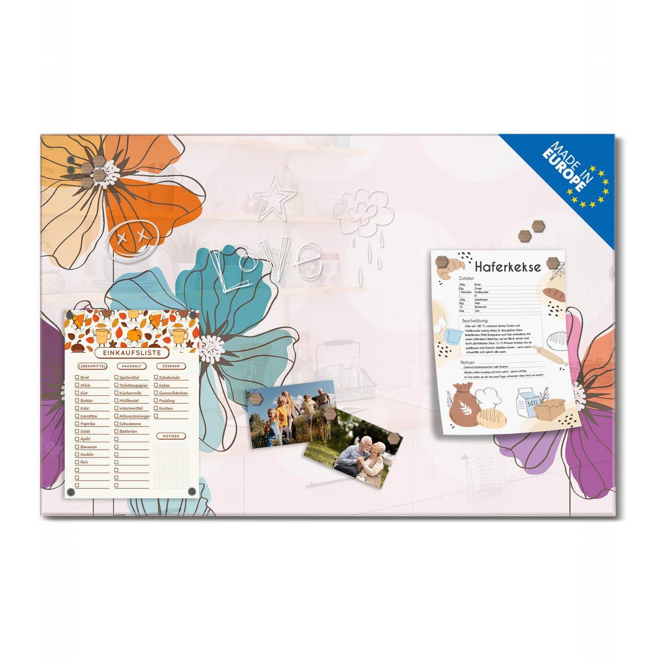 Ein Stück Design, das Ihren Alltag organisiert. Schreiben, heften, inspirieren - alles an einem Ort. Qualität, die man spürt. Montage leicht gemacht. Handwerk mit Herz - veredelt in Sachsen. Einzigartiges Design mit Motiv Motiv Bunter Mohn Beschreibbare Glasoberfläche, leicht zu reinigen Starke Magnetkraft durch Stahlrückwand Inklusive 4 Neodym-Magneten Flexible Montageoptionen Handveredelt in Sachsen - Qualität, die bleibt