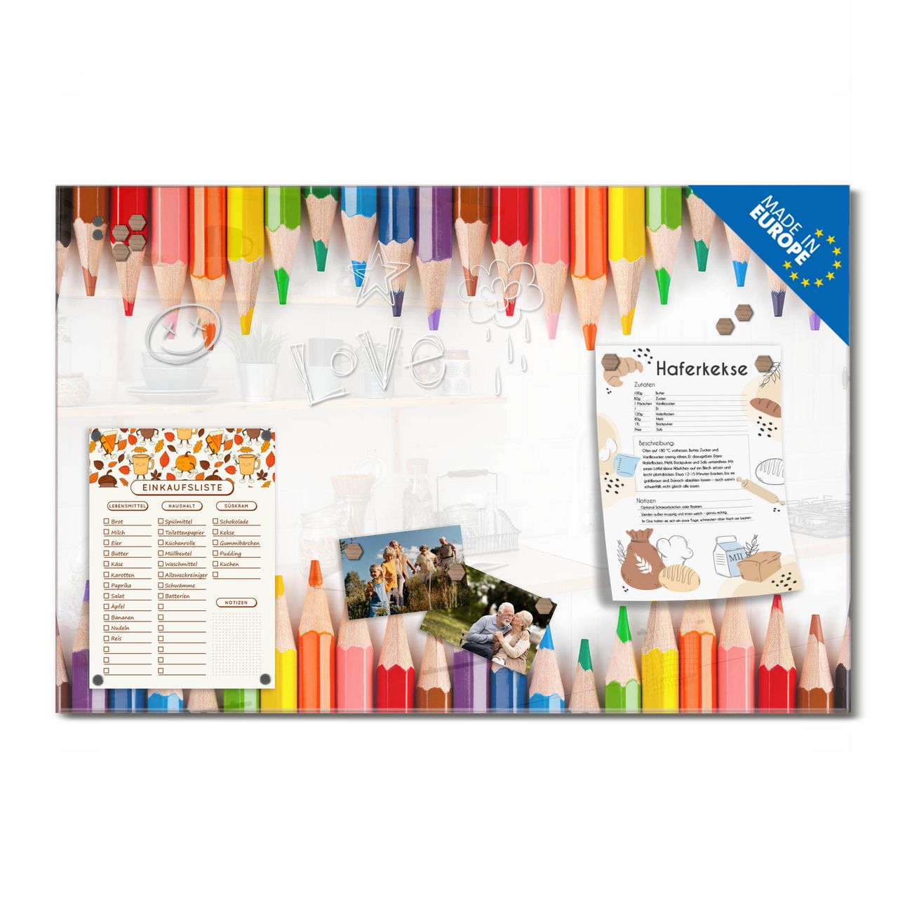 Ein Stück Design, das Ihren Alltag organisiert. Schreiben, heften, inspirieren - alles an einem Ort. Qualität, die man spürt. Montage leicht gemacht. Handwerk mit Herz - veredelt in Sachsen. Einzigartiges Design mit Motiv Motiv Buntstifte Beschreibbare Glasoberfläche, leicht zu reinigen Starke Magnetkraft durch Stahlrückwand Inklusive 4 Neodym-Magneten Flexible Montageoptionen Handveredelt in Sachsen - Qualität, die bleibt