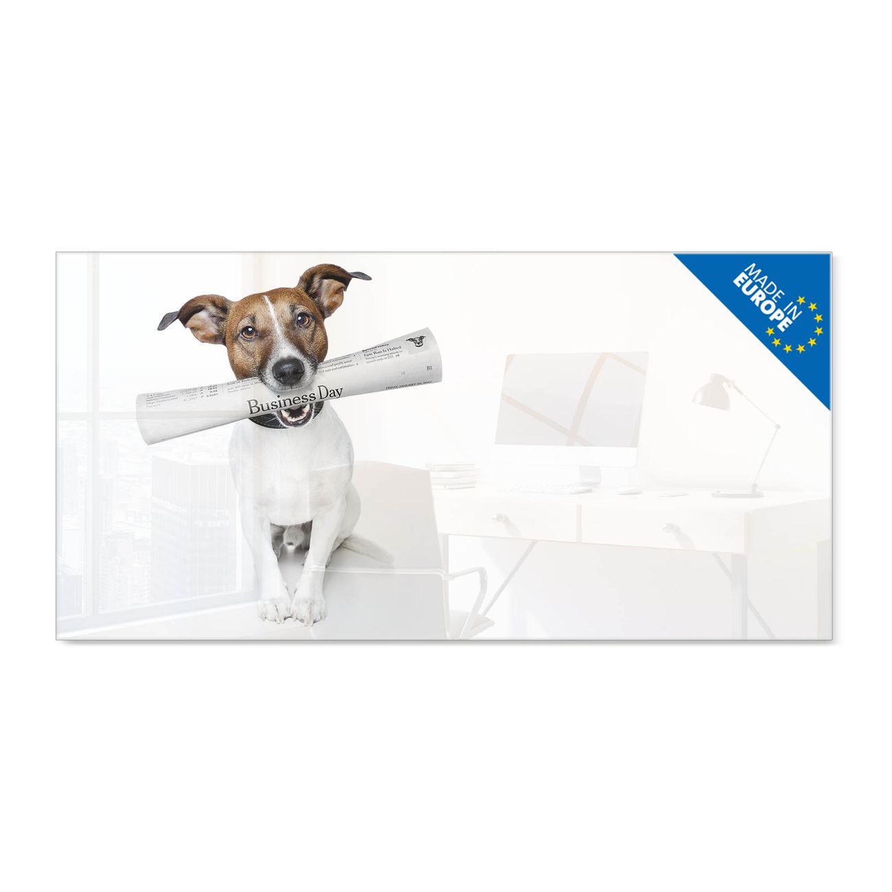 Material: 4mm Sicherheitsglas mit Metallrückwand Eigenschaften: beschreibbar, magnetisch, kratzfest Maße: 100x50x0,6cm, 7,50kg schwer Motiv Nummer 10329 Business Day Zubehör: inklusive 4 Neodym-Magnete