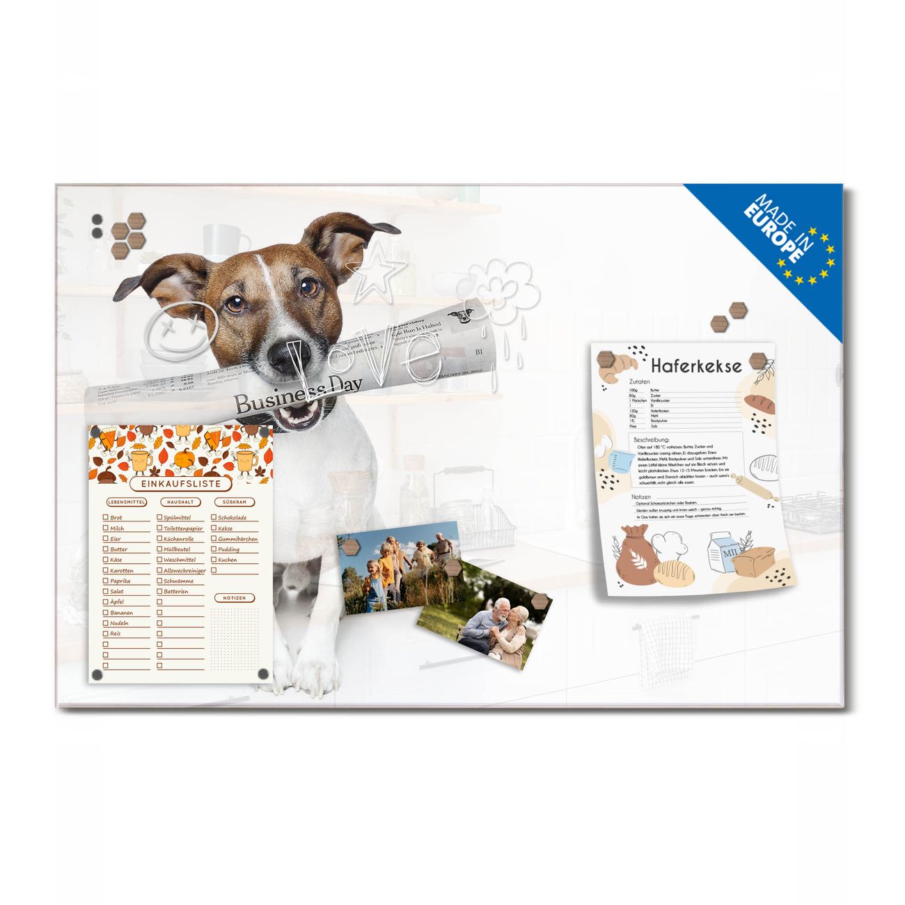 Auf der glatten Glasoberfläche lassen sich Termine, Rezepte oder Notizen ganz einfach mit Kreidestiften festhalten und rückstandslos entfernen. Starke Neodym-Magnete halten Ihre wichtigsten Erinnerungen sicher an Ort und Stelle. So entsteht Ihre ganz persönliche Ideenwand - jeden Tag neu.