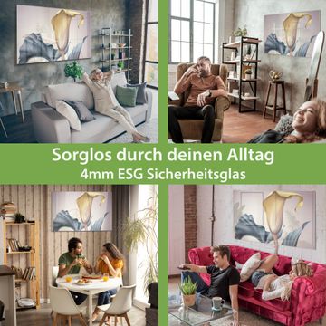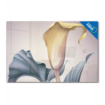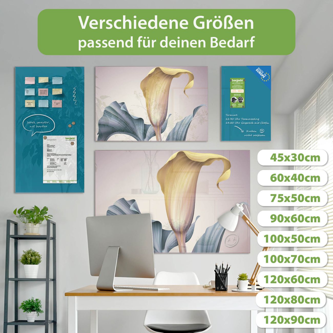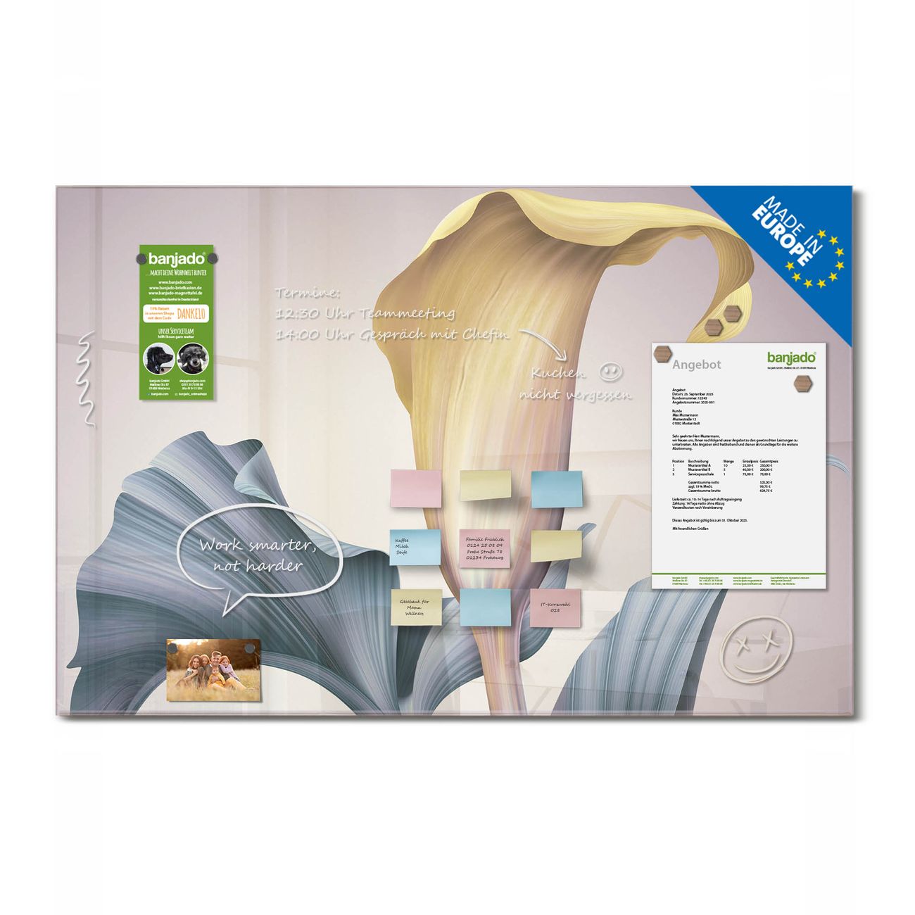 Material: 4mm Sicherheitsglas mit Metallrückwand Eigenschaften: beschreibbar, magnetisch, kratzfest Maße: 120x80x0,6cm, 14,40kg schwer Motiv Nummer 12339 Calla Zubehör: inklusive 4 Neodym-Magnete