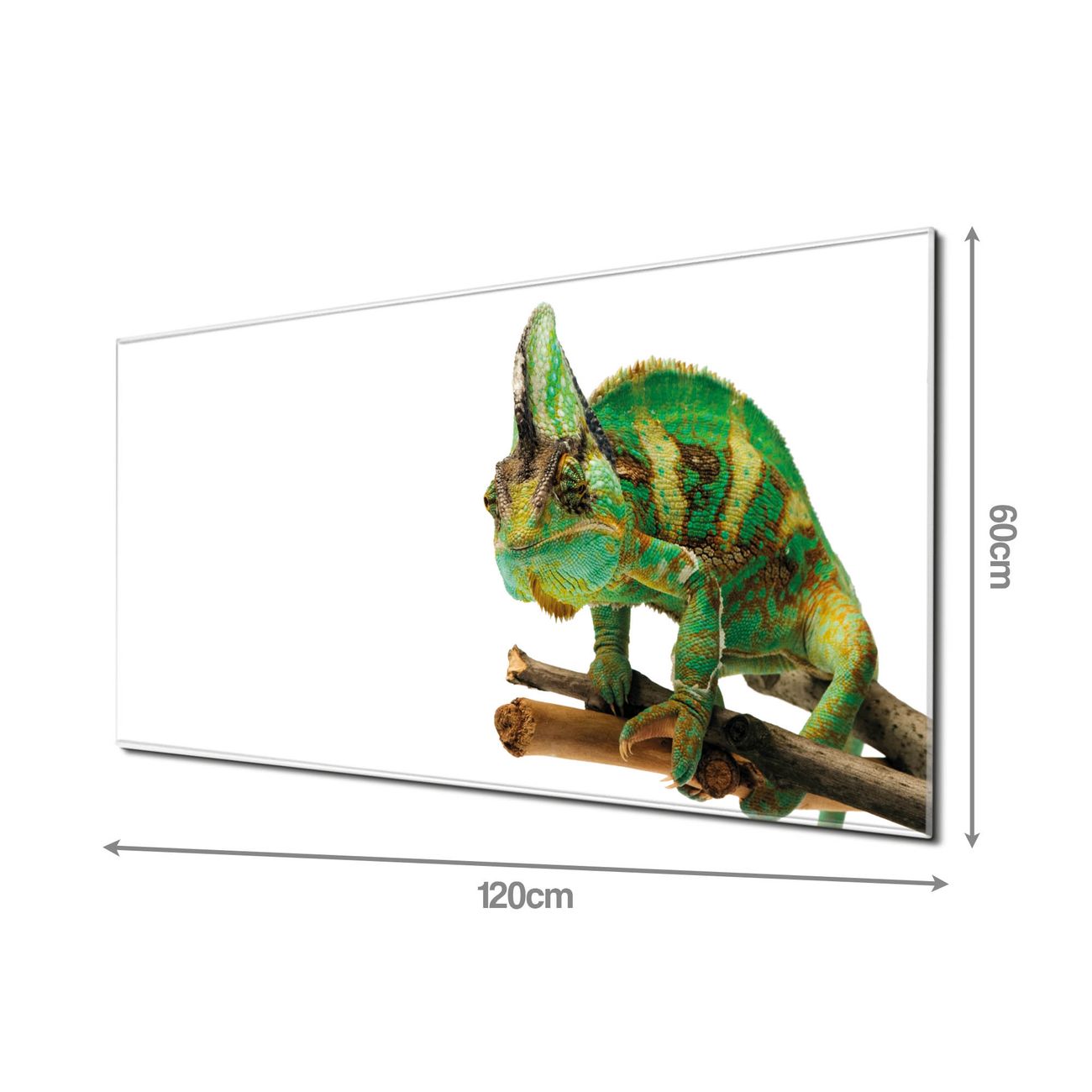 Material: 4mm Sicherheitsglas mit Metallrückwand Eigenschaften: beschreibbar, magnetisch, kratzfest Maße: 120x60x0,6cm, 10,80kg schwer Motiv Nummer 10178 Chamäleon Zubehör: inklusive 4 Neodym-Magnete