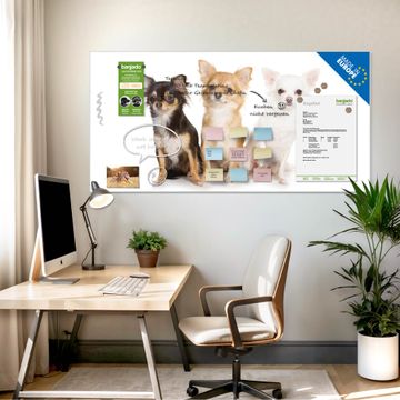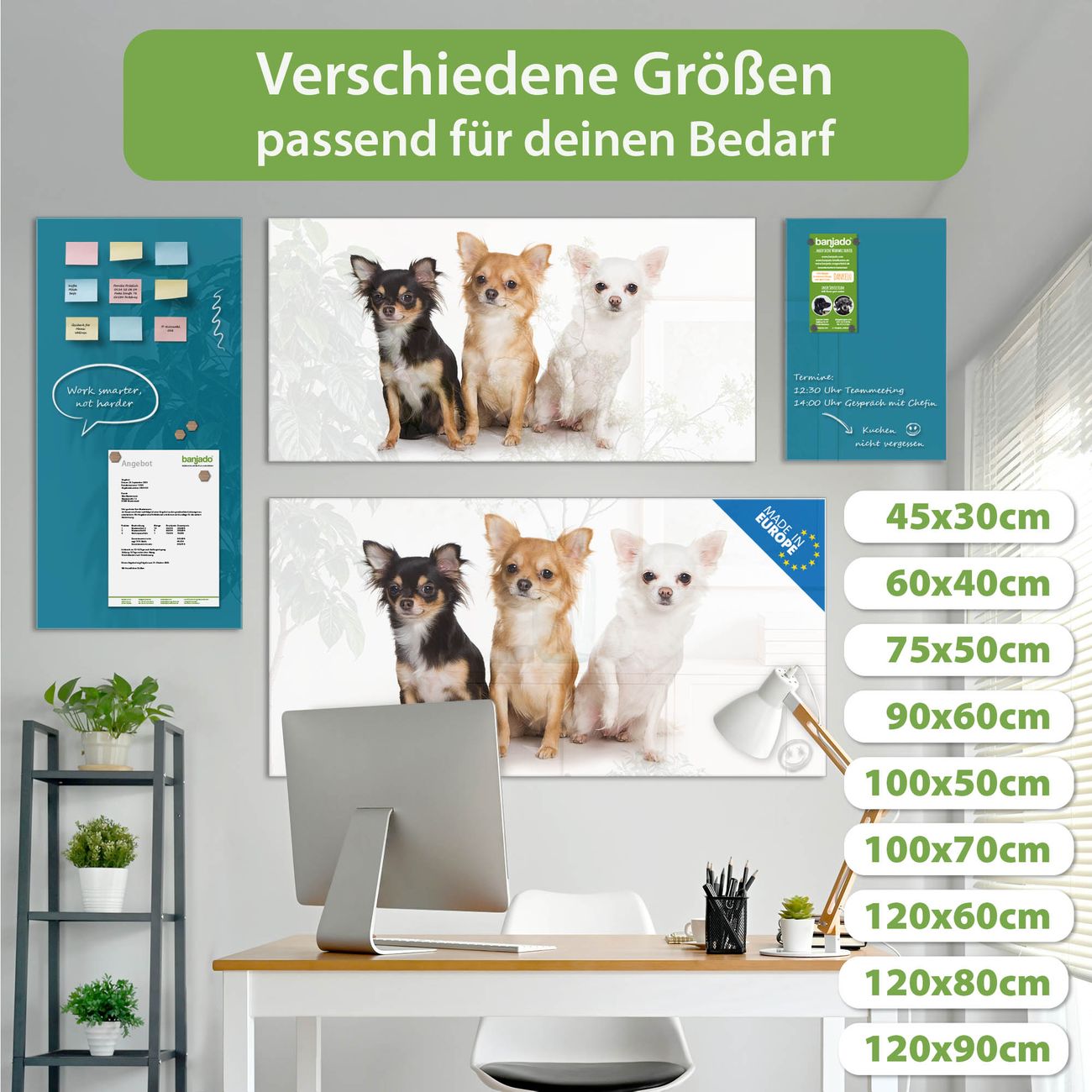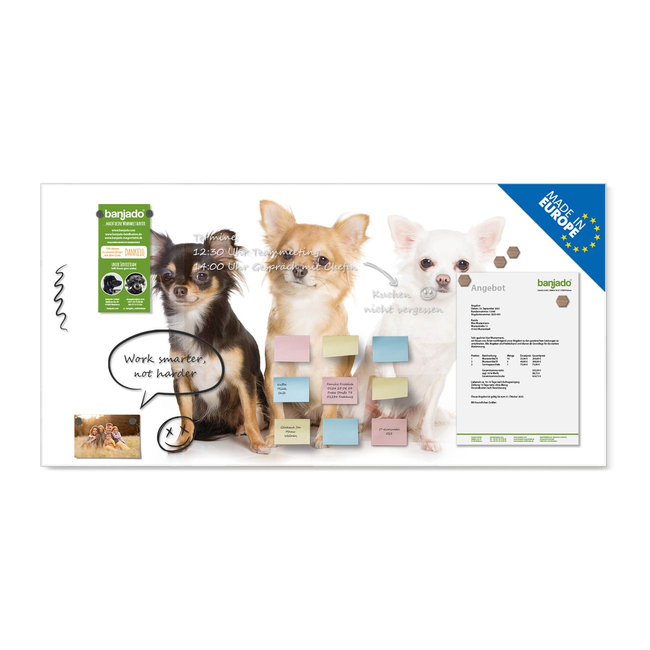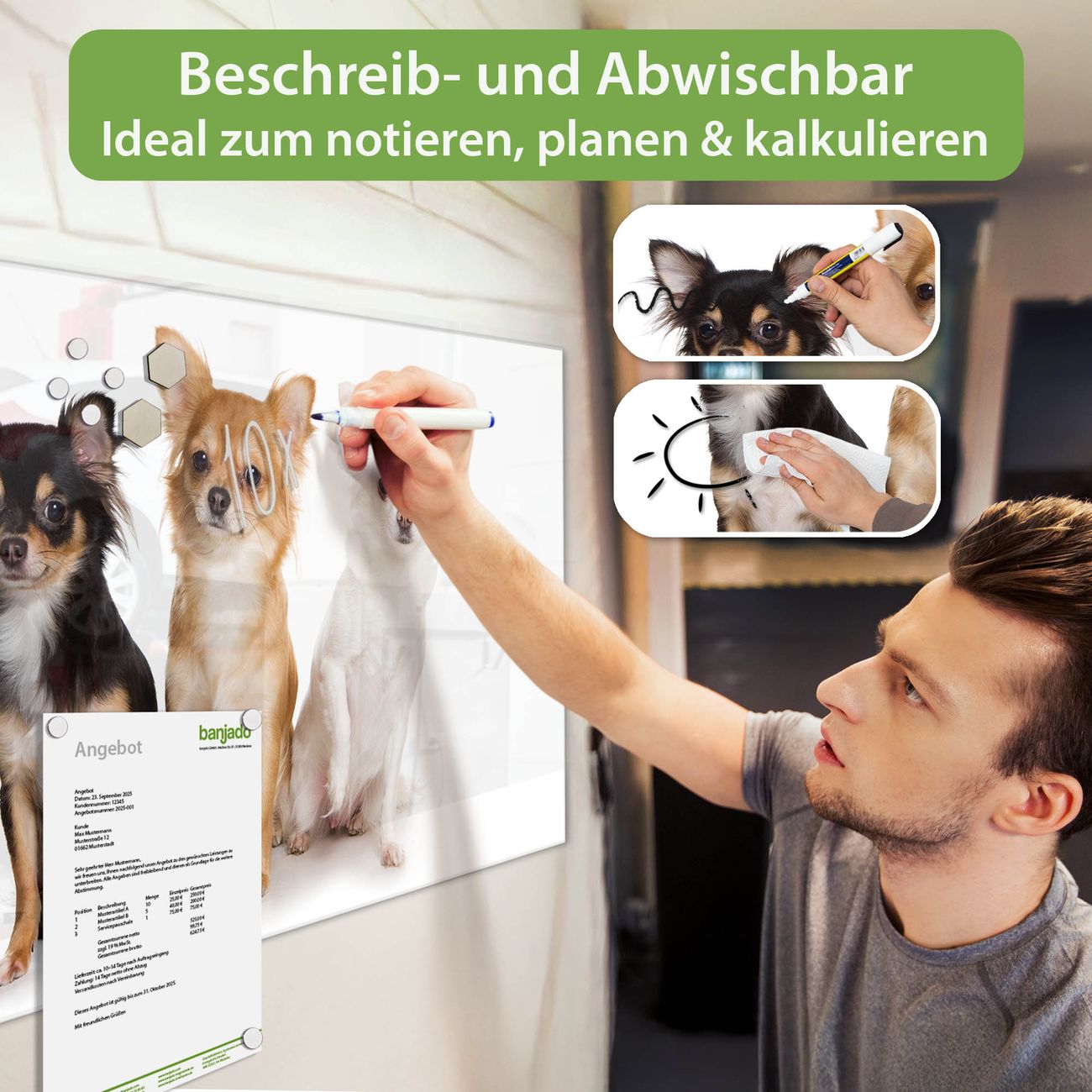 Material: 4mm Sicherheitsglas mit Metallrückwand Eigenschaften: beschreibbar, magnetisch, kratzfest Maße: 120x60x0,6cm, 10,80kg schwer Motiv Nummer 10005 Chihuahua Zubehör: inklusive 4 Neodym-Magnete