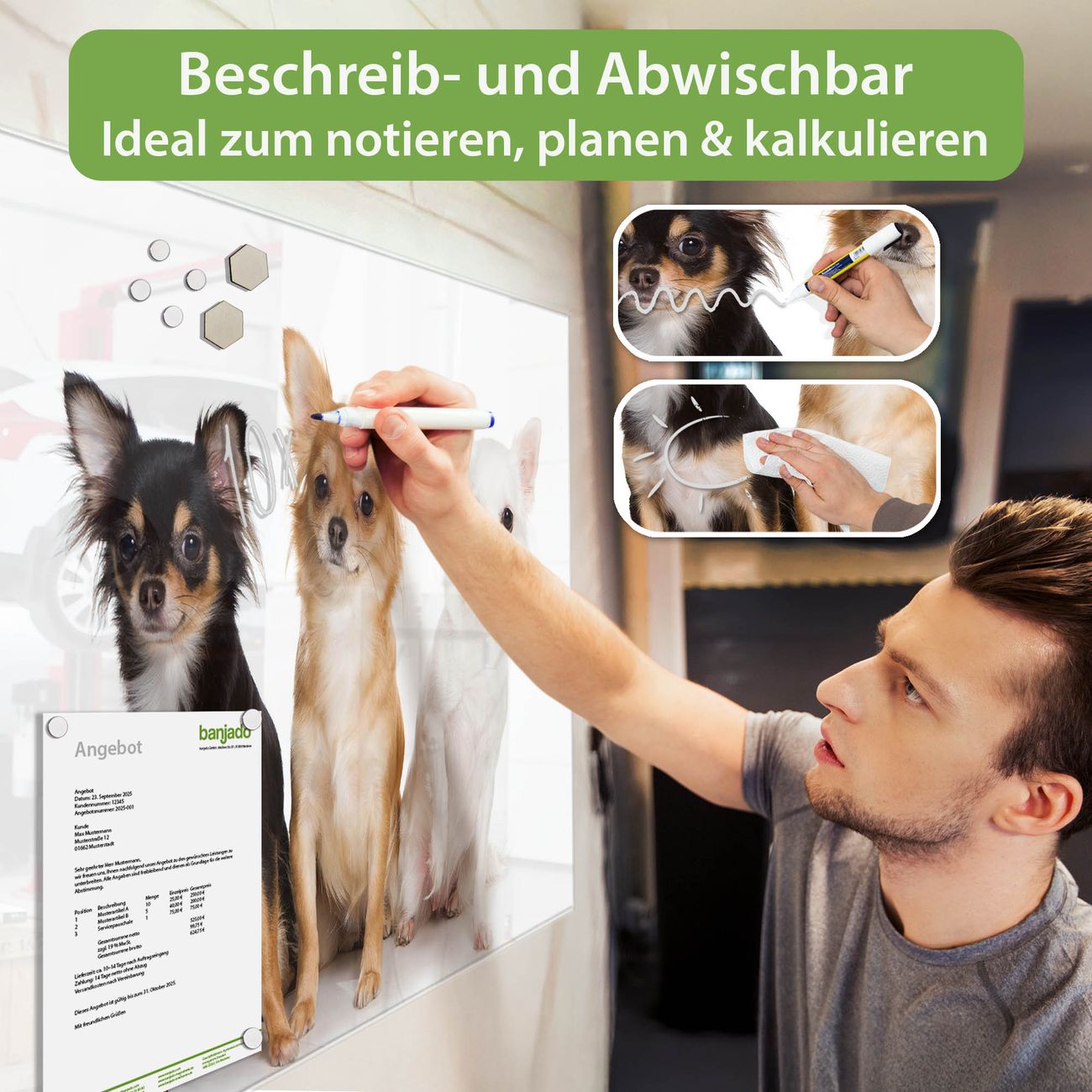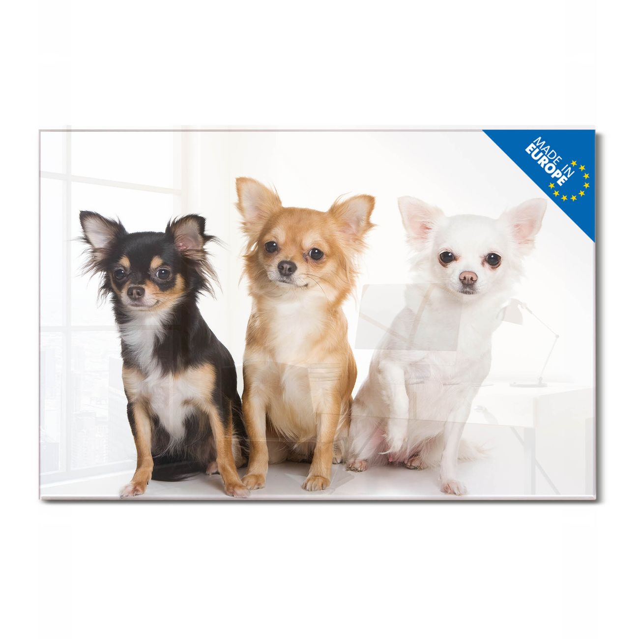 Material: 4mm Sicherheitsglas mit Metallrückwand Eigenschaften: beschreibbar, magnetisch, kratzfest Maße: 120x80x0,6cm, 14,40kg schwer Motiv Nummer 10005 Chihuahua Zubehör: inklusive 4 Neodym-Magnete