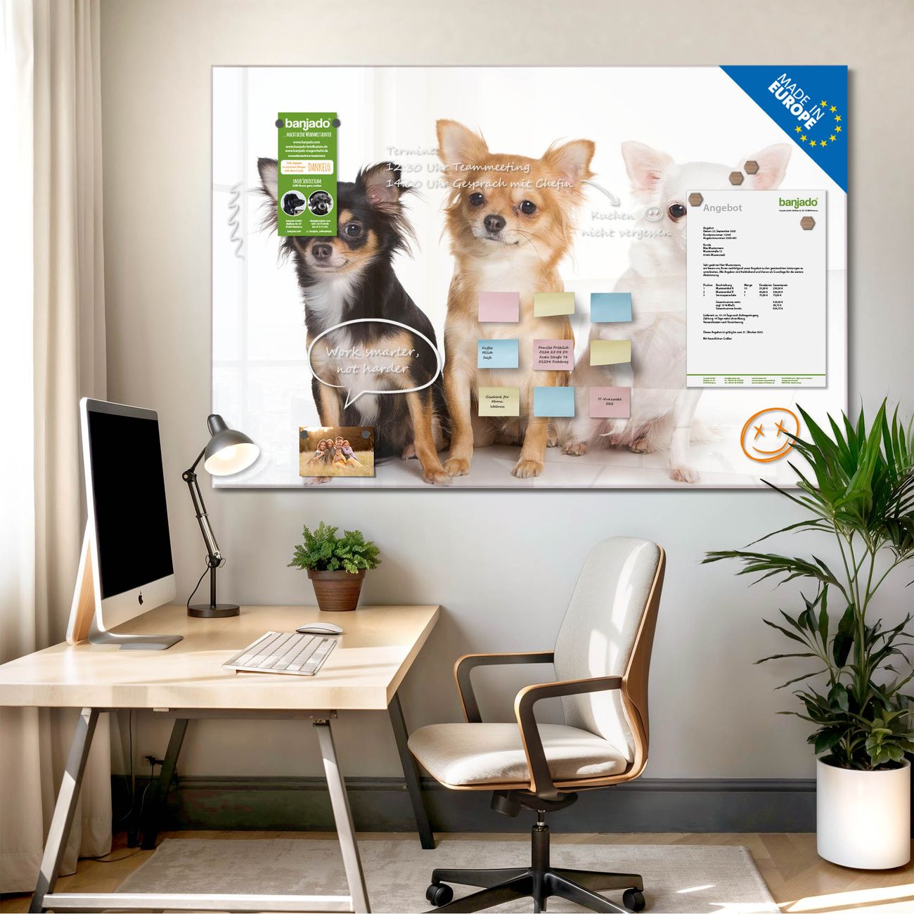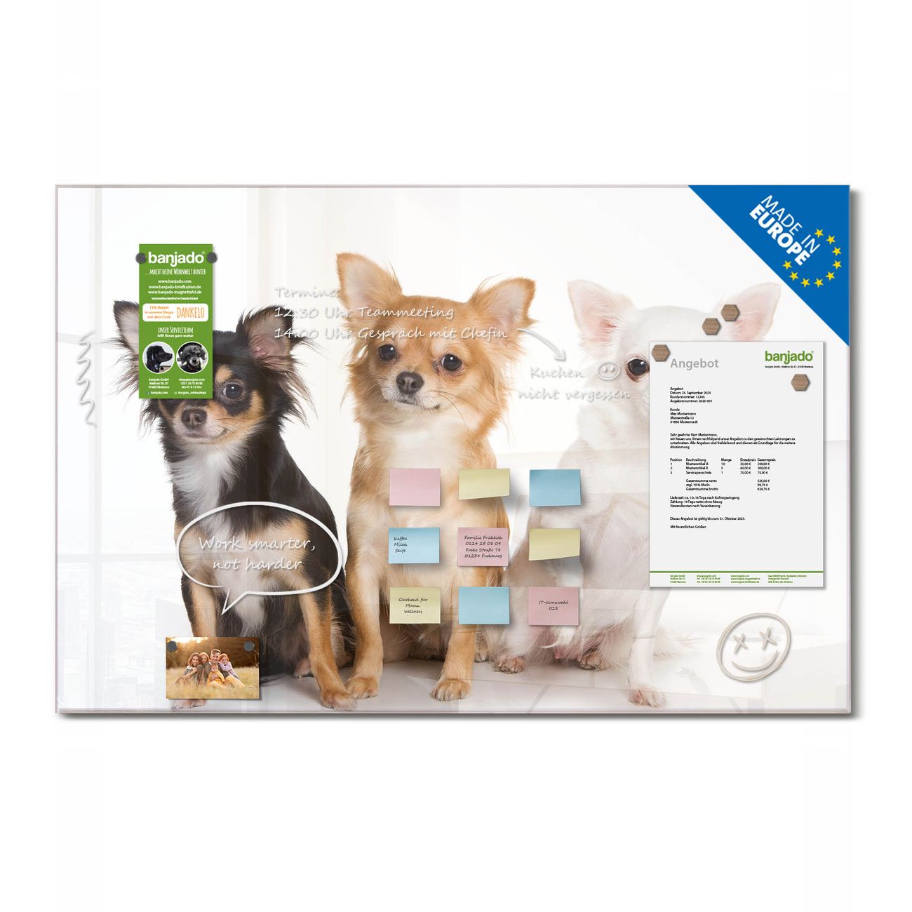 Jede Glas Magnettafel wird in unserer Werkstatt von Hand gefertigt und sorgfältig geprüft. So erhalten Sie ein echtes Qualitätsprodukt, das Funktion und Ästhetik perfekt vereint.?? Warum banjado?
