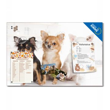 Material: 4mm Sicherheitsglas mit Metallrückwand Eigenschaften: beschreibbar, magnetisch, kratzfest Maße: 75x50x0,6cm, 5,63kg schwer Motiv Nummer 10005 Chihuahua Zubehör: inklusive 4 Neodym-Magnete