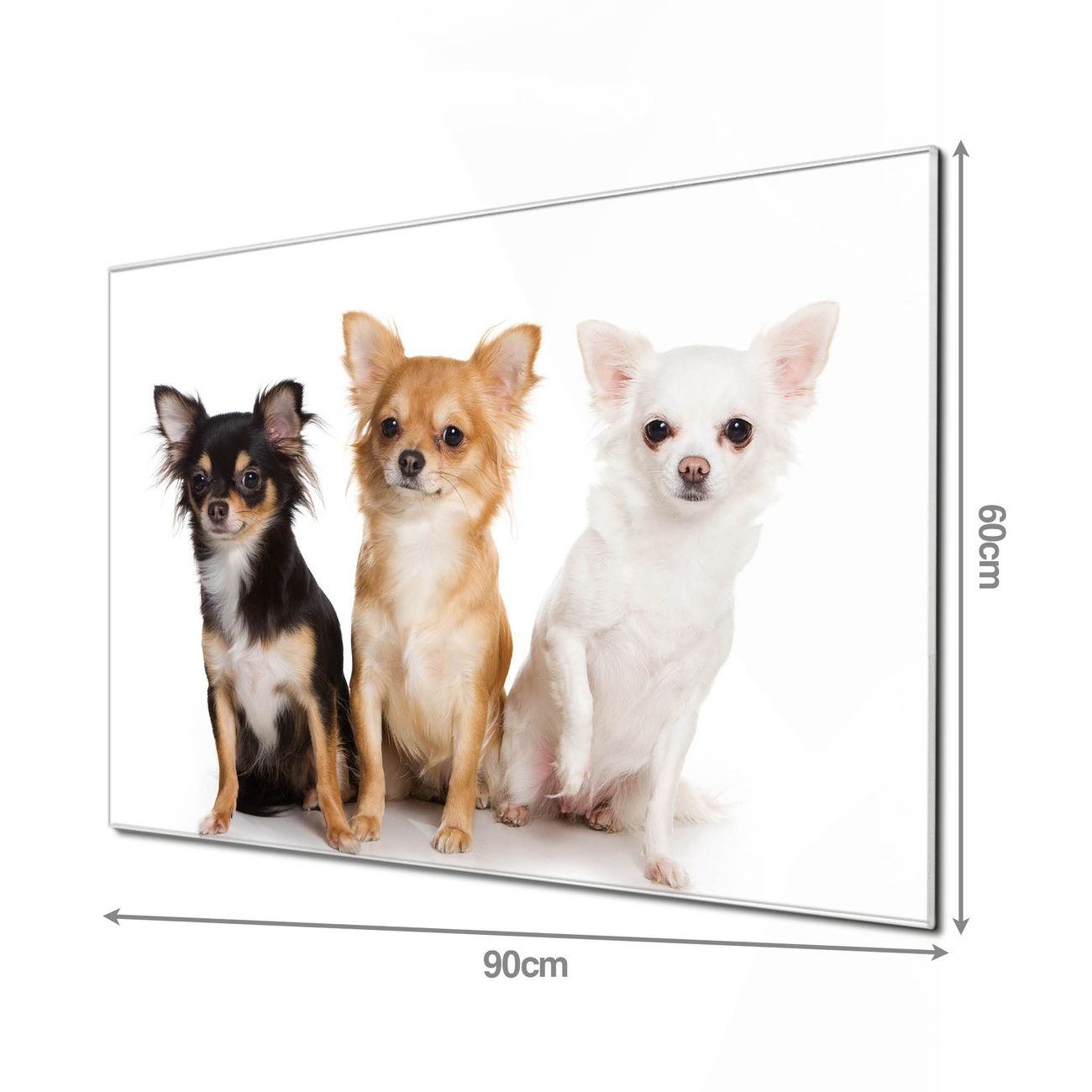 Material: 4mm Sicherheitsglas mit Metallrückwand Eigenschaften: beschreibbar, magnetisch, kratzfest Maße: 90x60x0,6cm, 8,10kg schwer Motiv Nummer 10005 Chihuahua Zubehör: inklusive 4 Neodym-Magnete