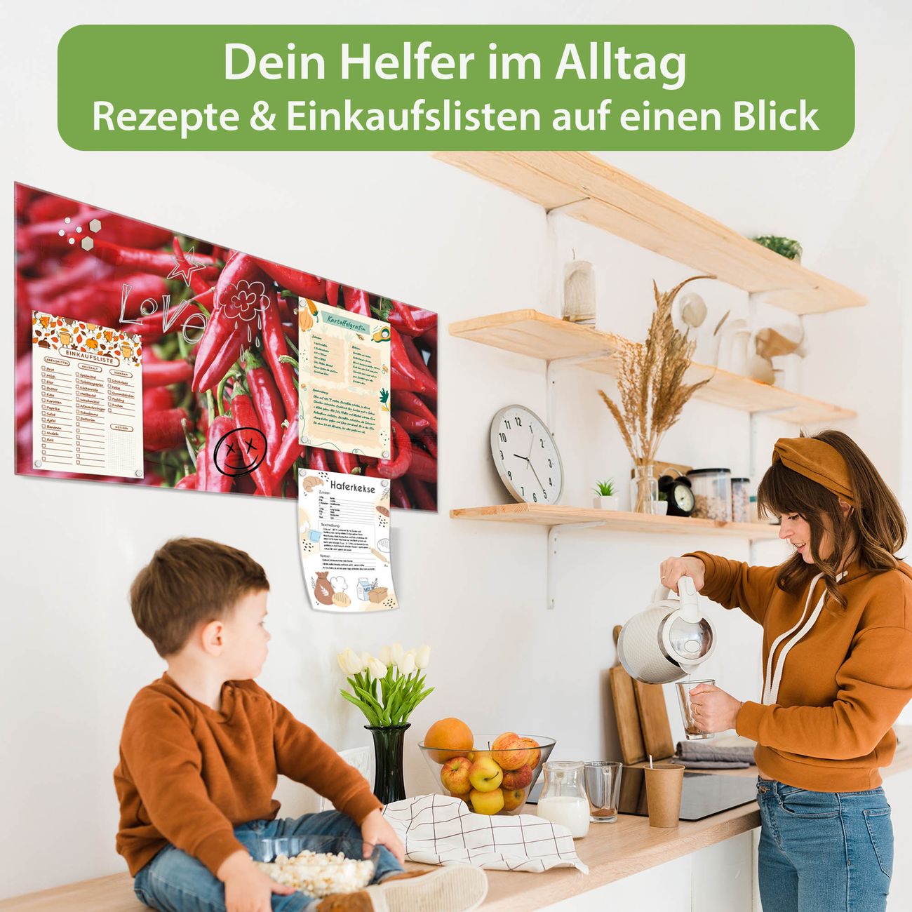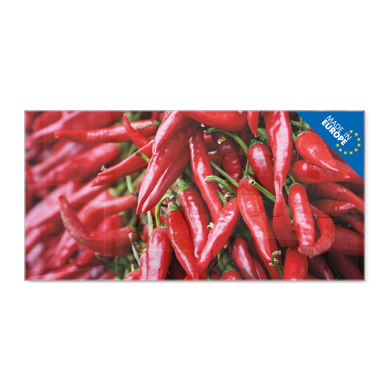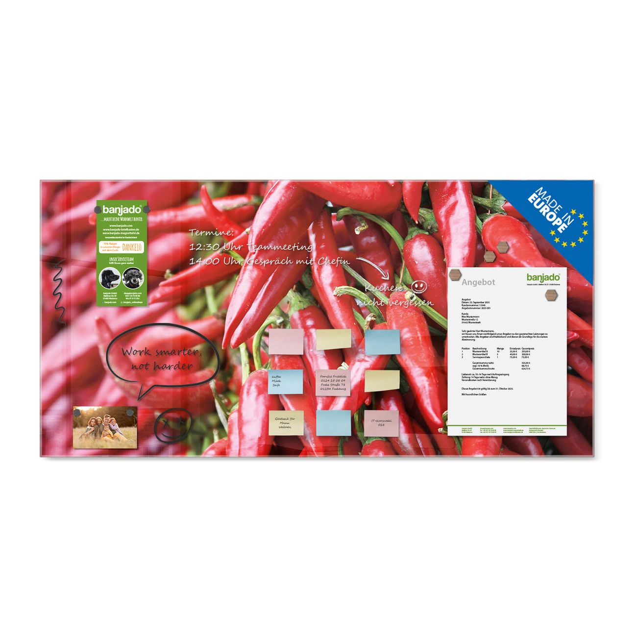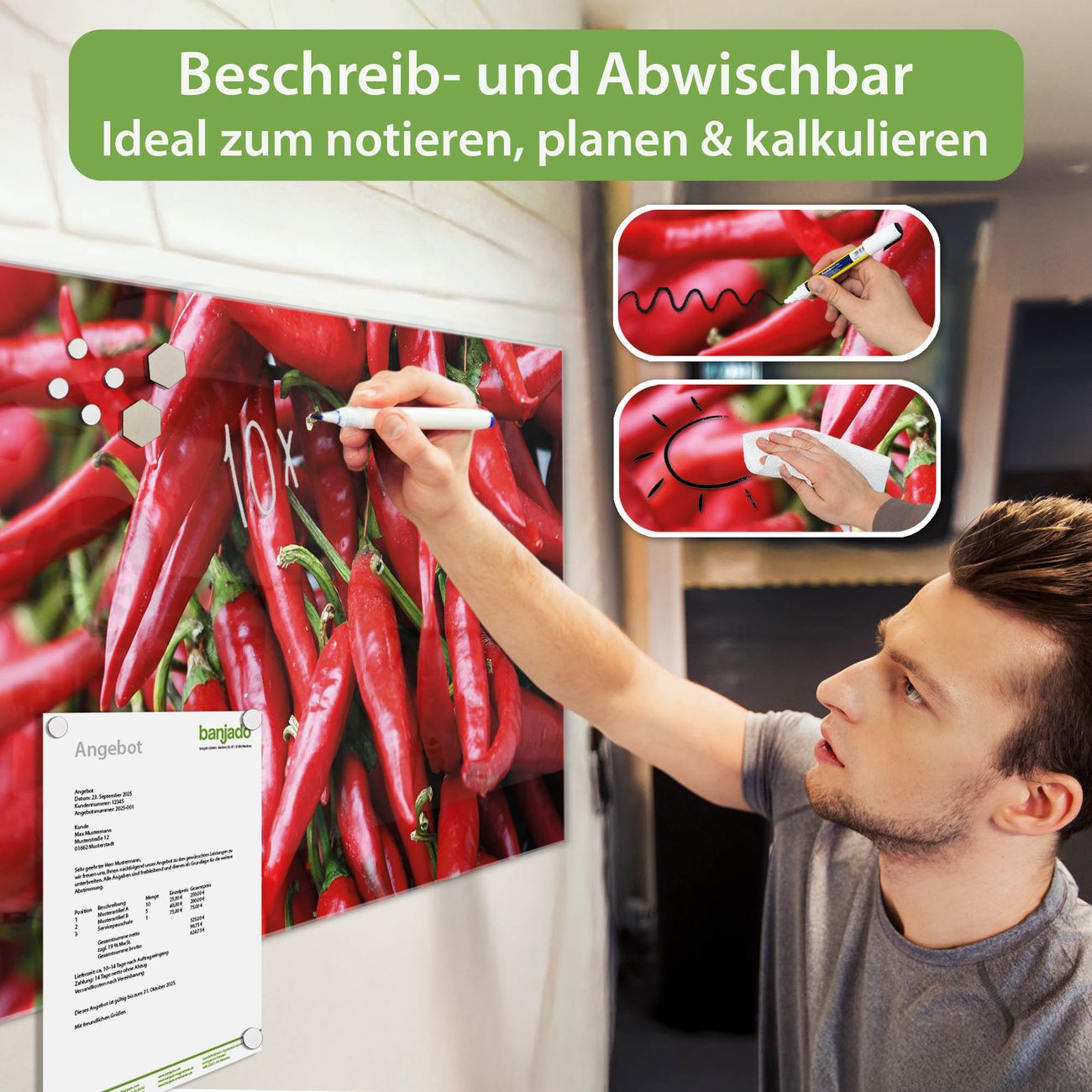 Material: 4mm Sicherheitsglas mit Metallrückwand Eigenschaften: beschreibbar, magnetisch, kratzfest Maße: 120x60x0,6cm, 10,80kg schwer Motiv Nummer 10006 Chilli Zubehör: inklusive 4 Neodym-Magnete
