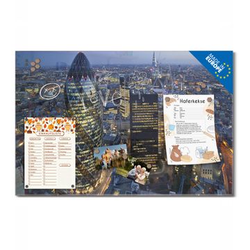 Material: 4mm Sicherheitsglas mit Metallrückwand Eigenschaften: beschreibbar, magnetisch, kratzfest Maße: 75x50x0,6cm, 5,63kg schwer Motiv Nummer 12408 City Of London Zubehör: inklusive 4 Neodym-Magnete