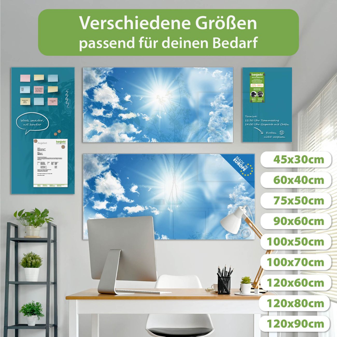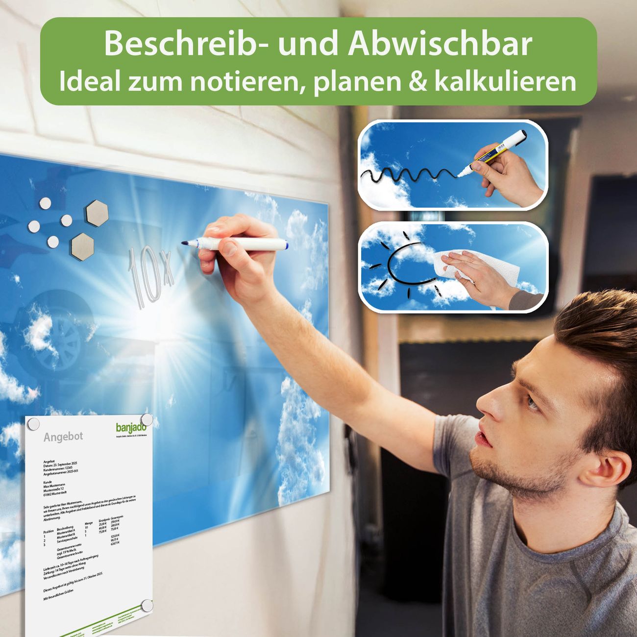 Jede Glas Magnettafel wird in unserer Werkstatt von Hand gefertigt und sorgfältig geprüft. So erhalten Sie ein echtes Qualitätsprodukt, das Funktion und Ästhetik perfekt vereint.?? Warum banjado?