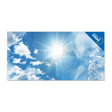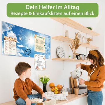 Material: 4mm Sicherheitsglas mit Metallrückwand Eigenschaften: beschreibbar, magnetisch, kratzfest Maße: 110x55x0,6cm, 9,08kg schwer Motiv Nummer 10095 Clouds Zubehör: inklusive 4 Neodym-Magnete