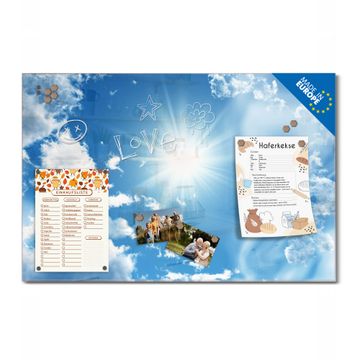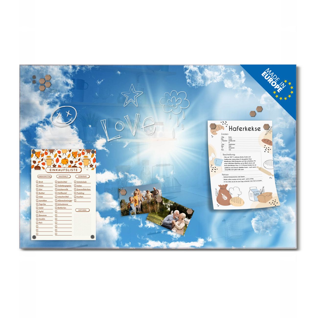 Material: 4mm Sicherheitsglas mit Metallrückwand Eigenschaften: beschreibbar, magnetisch, kratzfest Maße: 75x50x0,6cm, 5,63kg schwer Motiv Nummer 10095 Clouds Zubehör: inklusive 4 Neodym-Magnete