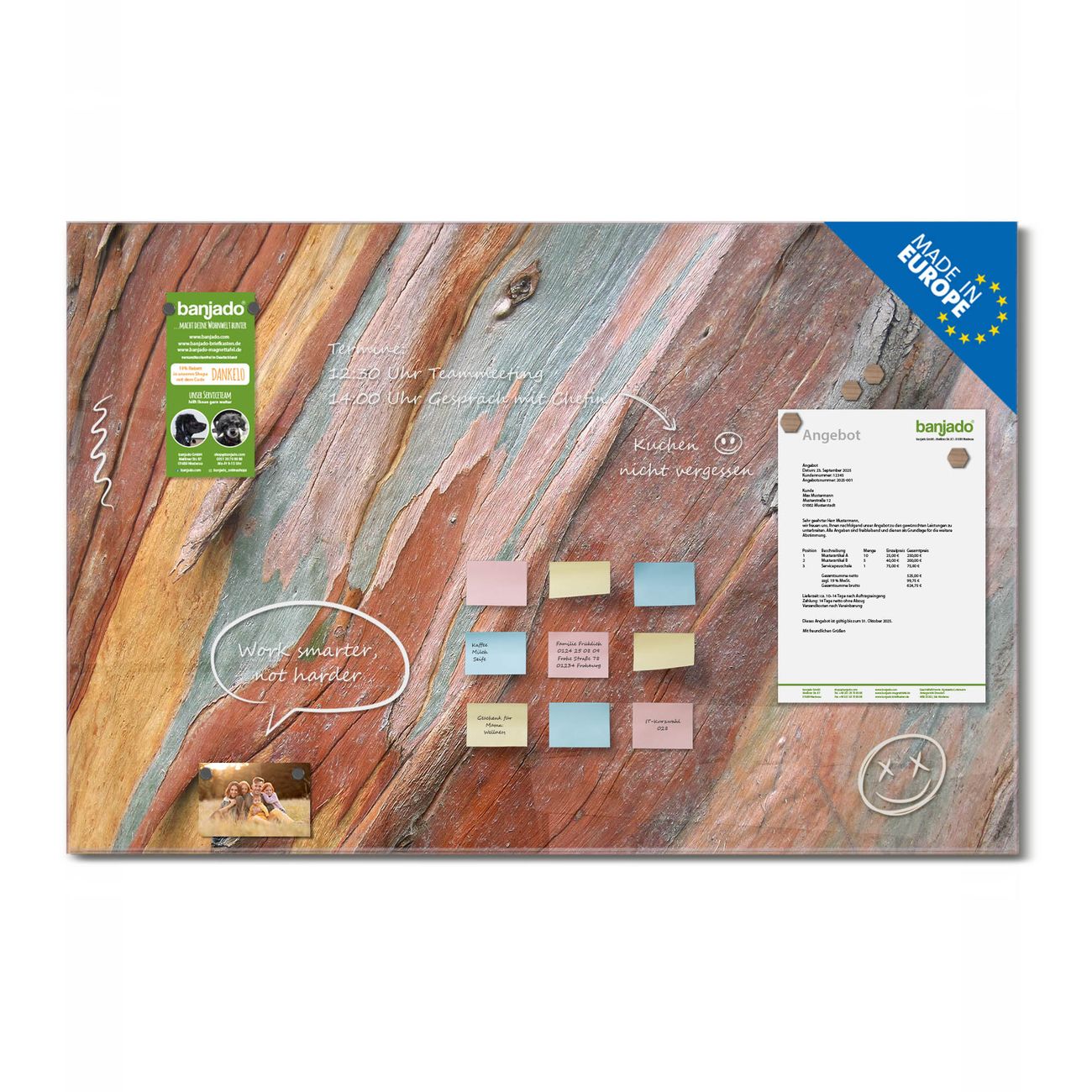 Material: 4mm Sicherheitsglas mit Metallrückwand Eigenschaften: beschreibbar, magnetisch, kratzfest Maße: 120x80x0,6cm, 14,40kg schwer Motiv Nummer 10434 Coloured Wood Zubehör: inklusive 4 Neodym-Magnete