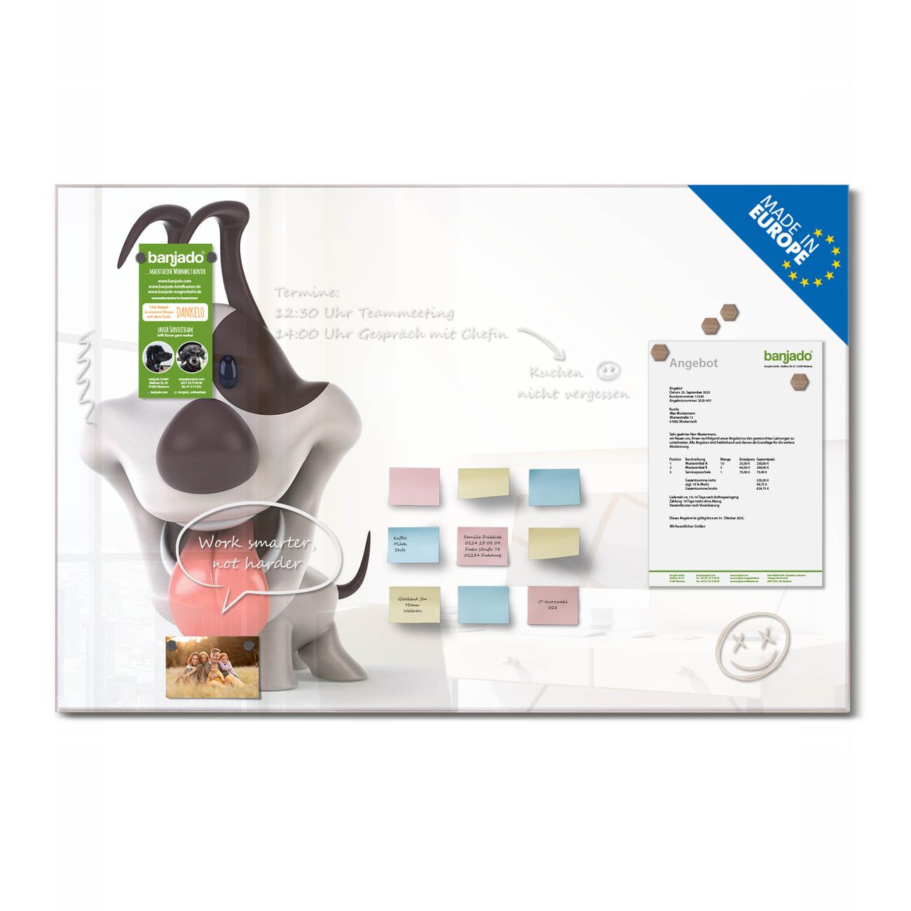 Jede Glas Magnettafel wird in unserer Werkstatt von Hand gefertigt und sorgfältig geprüft. So erhalten Sie ein echtes Qualitätsprodukt, das Funktion und Ästhetik perfekt vereint.?? Warum banjado?