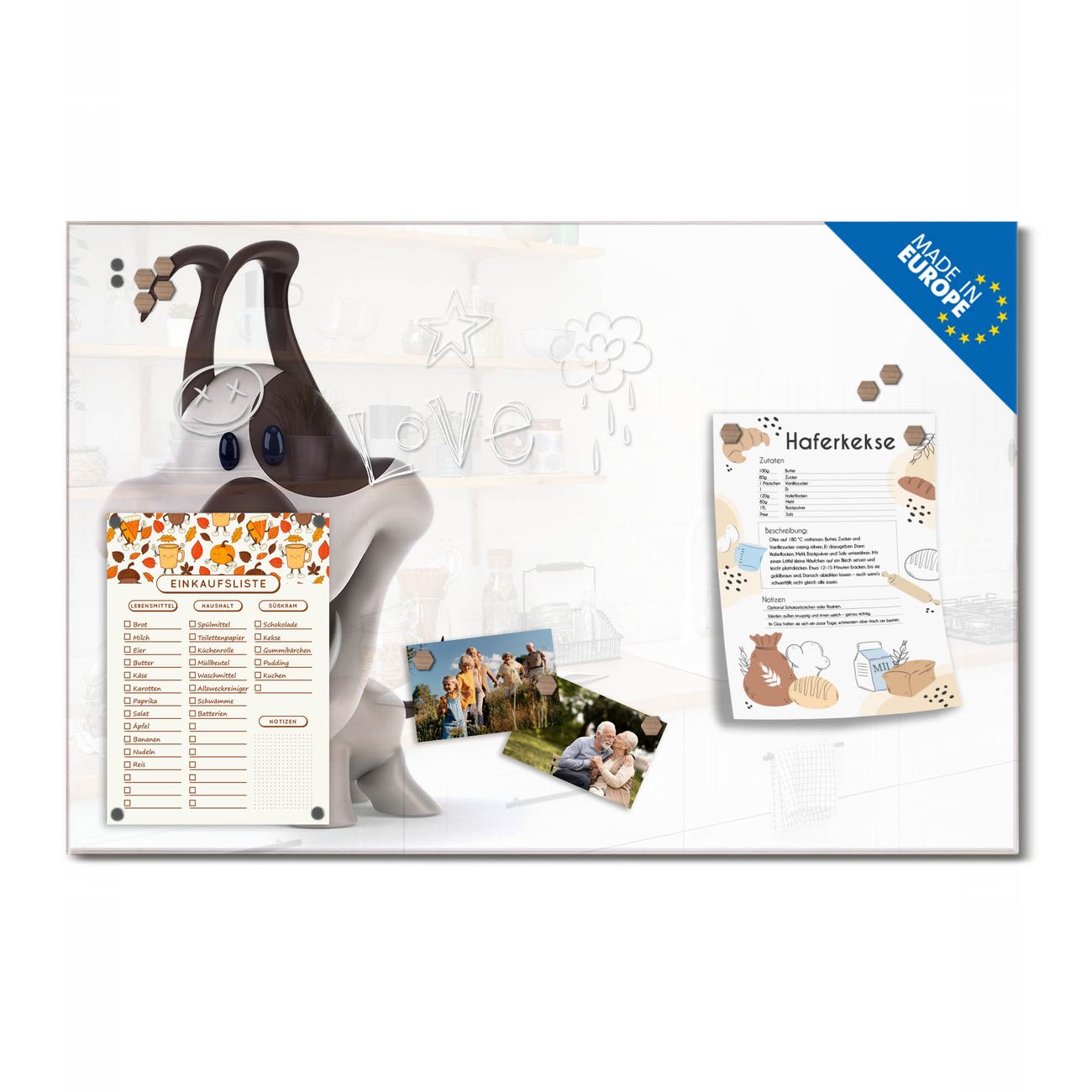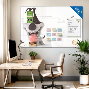 Auf der glatten Glasoberfläche lassen sich Termine, Rezepte oder Notizen ganz einfach mit Kreidestiften festhalten und rückstandslos entfernen. Starke Neodym-Magnete halten Ihre wichtigsten Erinnerungen sicher an Ort und Stelle. So entsteht Ihre ganz persönliche Ideenwand - jeden Tag neu.