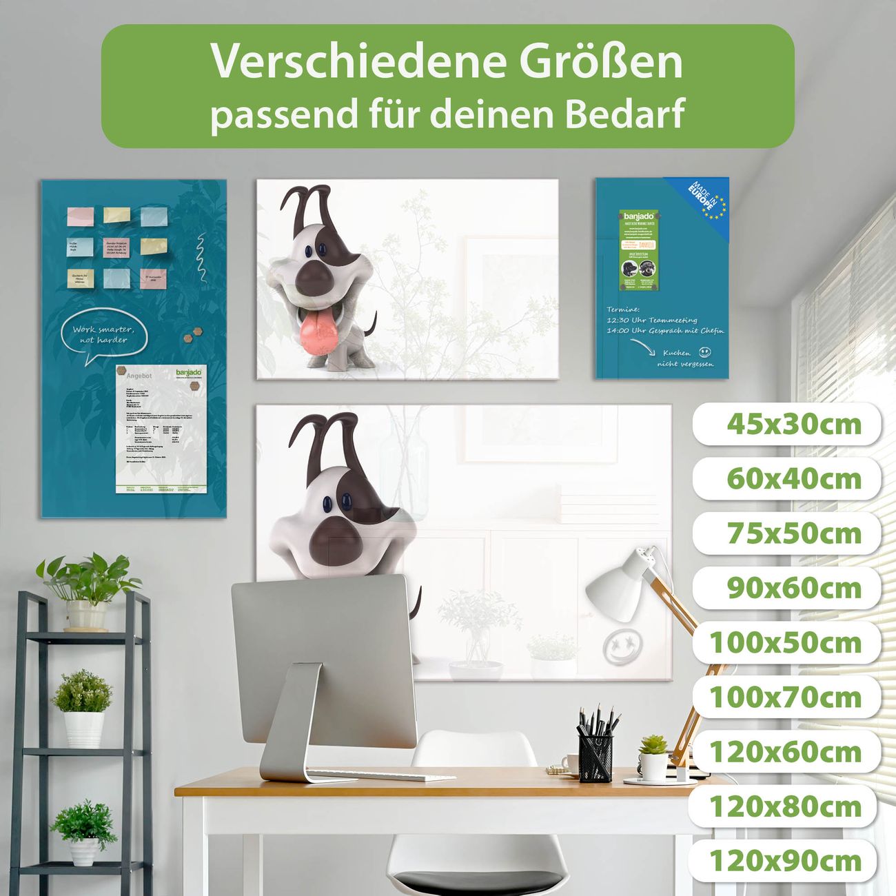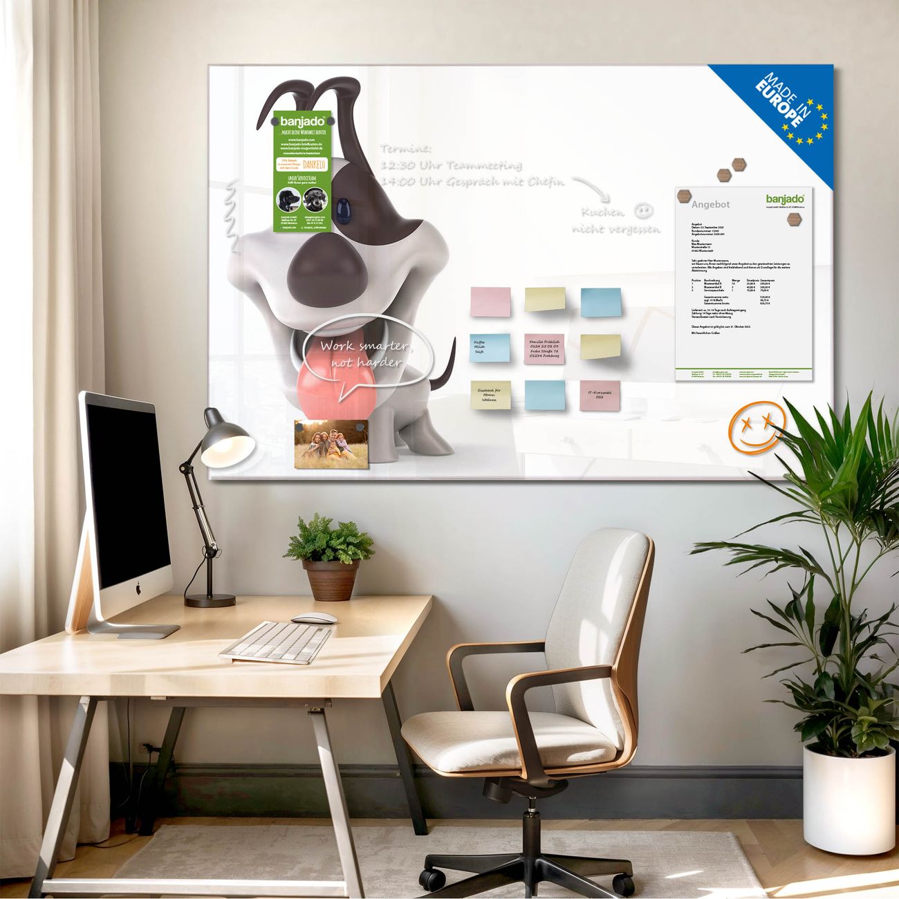 Die banjado Glas Magnettafel mit dem Motiv Motiv Comic-Hund verbindet Funktionalität mit Stil. Sie ersetzt das Zettelchaos durch klare Strukturen und bringt dabei eine warme, natürliche Atmosphäre in Ihr Zuhause. Ob im Büro, in der Küche oder im Eingangsbereich - dieses Design-Board zieht Blicke an und sorgt für Ordnung mit Charakter.