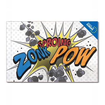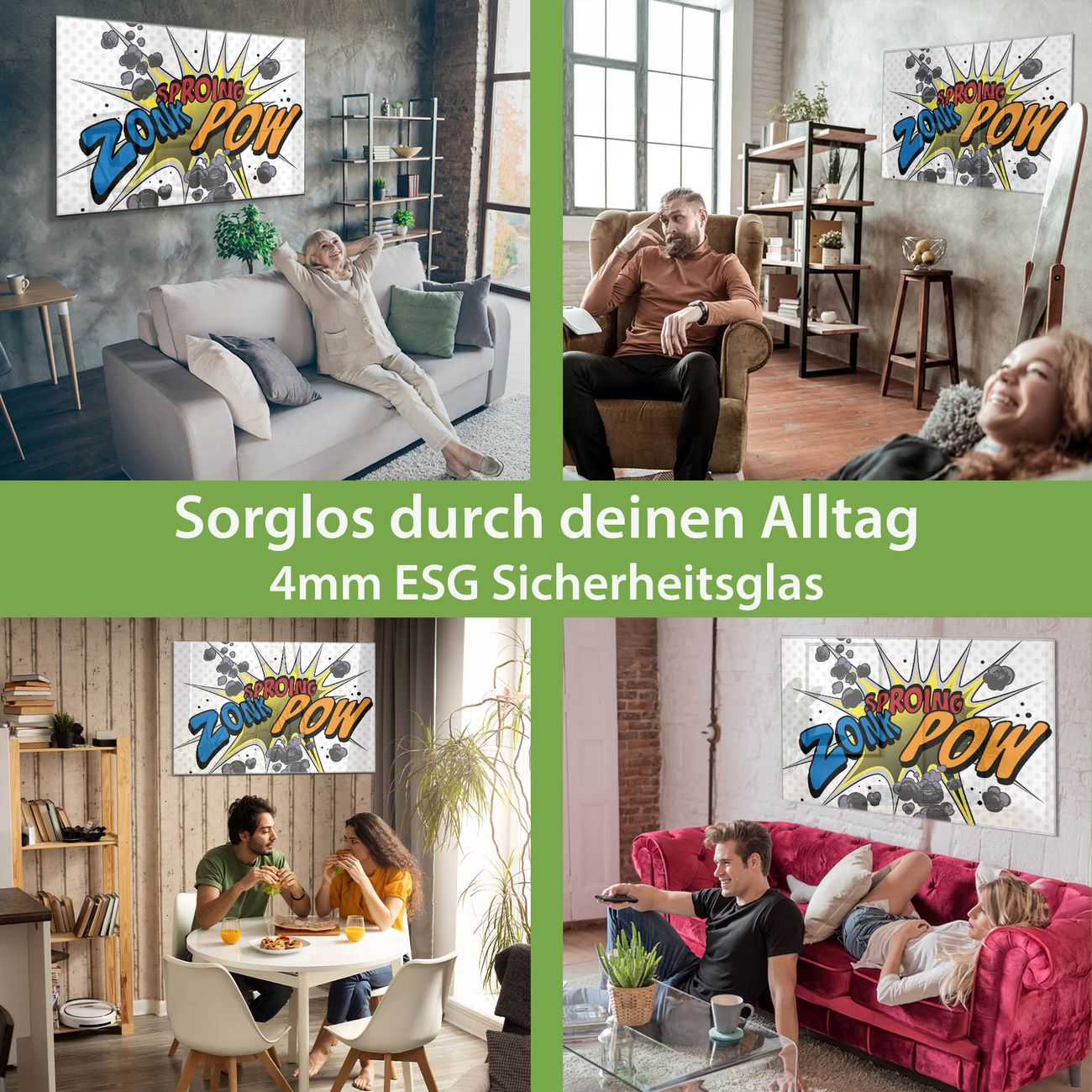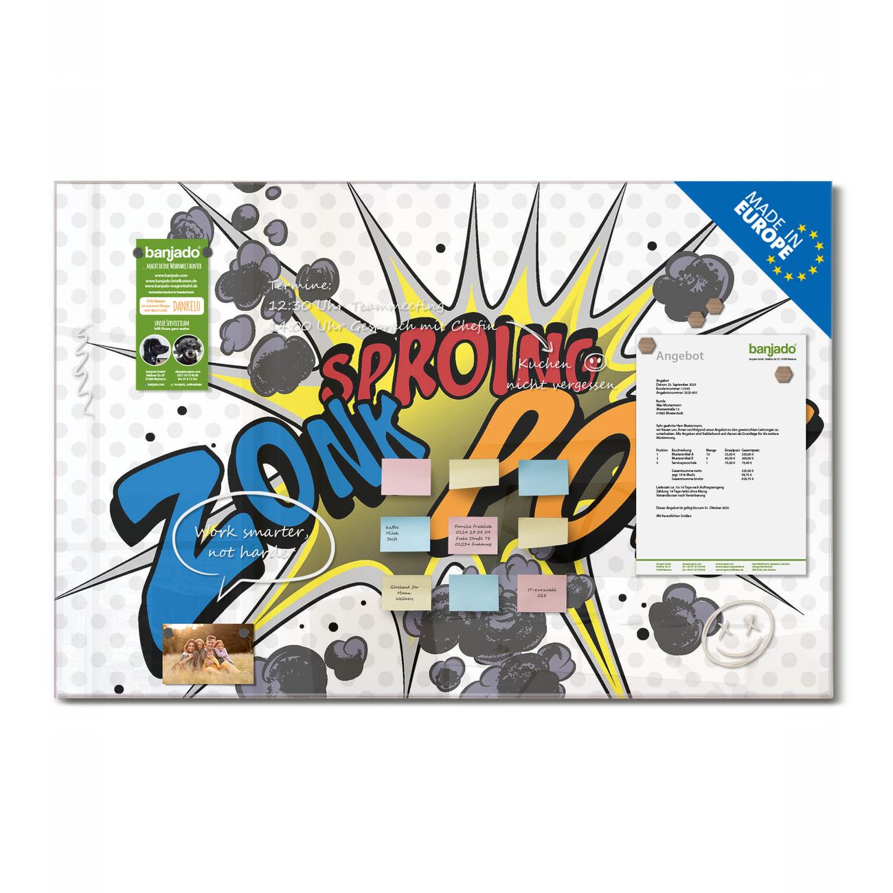 Material: 4mm Sicherheitsglas mit Metallrückwand Eigenschaften: beschreibbar, magnetisch, kratzfest Maße: 120x80x0,6cm, 14,40kg schwer Motiv Nummer 10278 Comic Zubehör: inklusive 4 Neodym-Magnete
