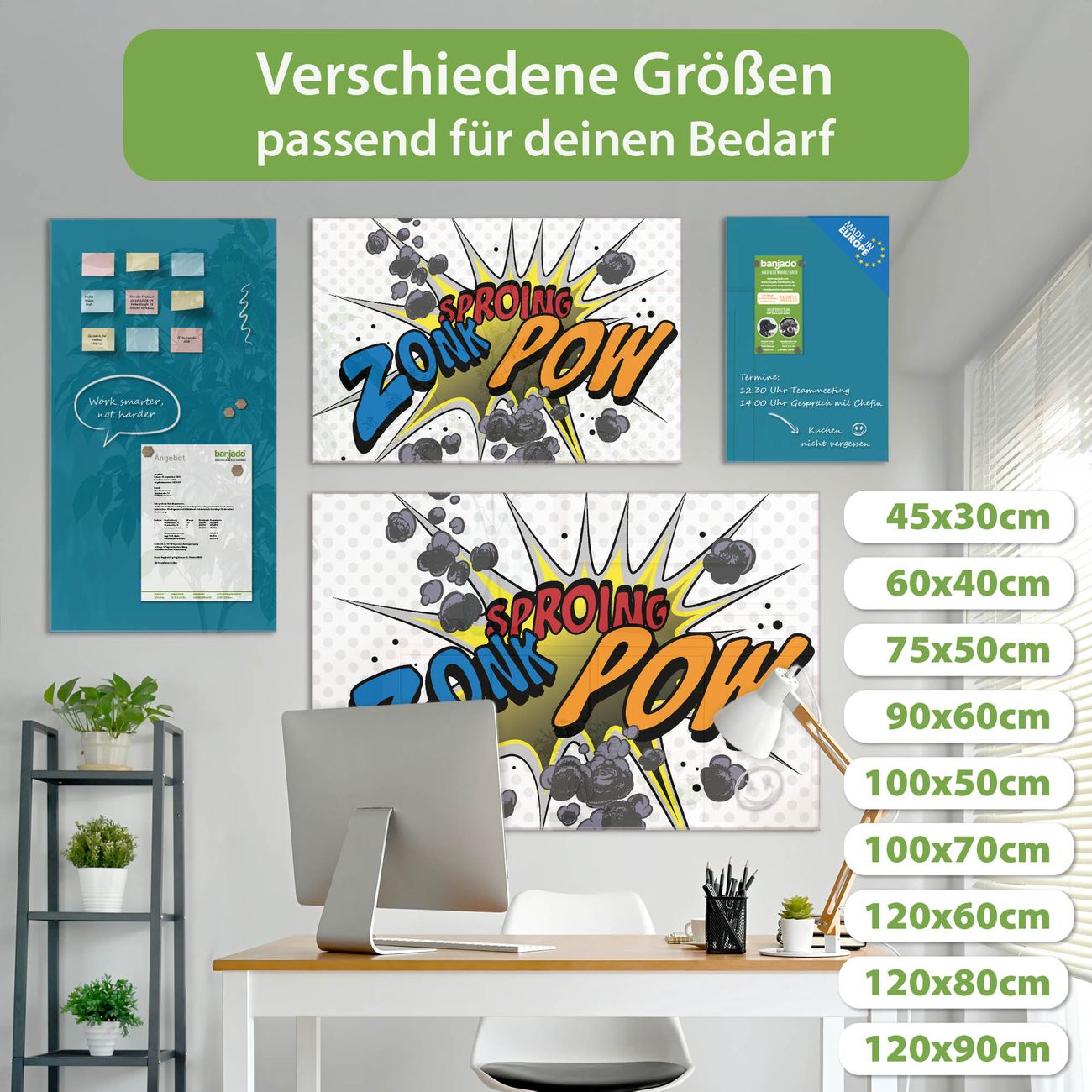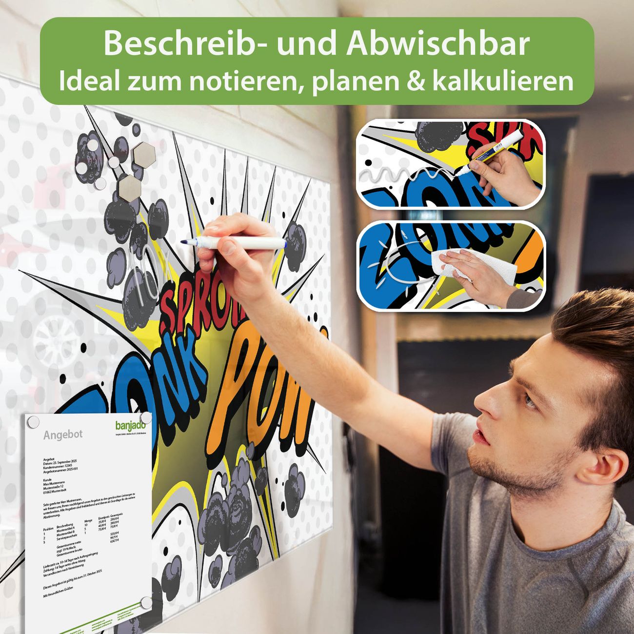 Die banjado Glas Magnettafel mit dem Motiv Motiv Comic verbindet Funktionalität mit Stil. Sie ersetzt das Zettelchaos durch klare Strukturen und bringt dabei eine warme, natürliche Atmosphäre in Ihr Zuhause. Ob im Büro, in der Küche oder im Eingangsbereich - dieses Design-Board zieht Blicke an und sorgt für Ordnung mit Charakter.