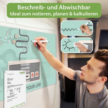 Material: 4mm Sicherheitsglas mit Metallrückwand Eigenschaften: beschreibbar, magnetisch, kratzfest Maße: 100x50x0,6cm, 7,50kg schwer Motiv Nummer 12476 Control Zubehör: inklusive 4 Neodym-Magnete