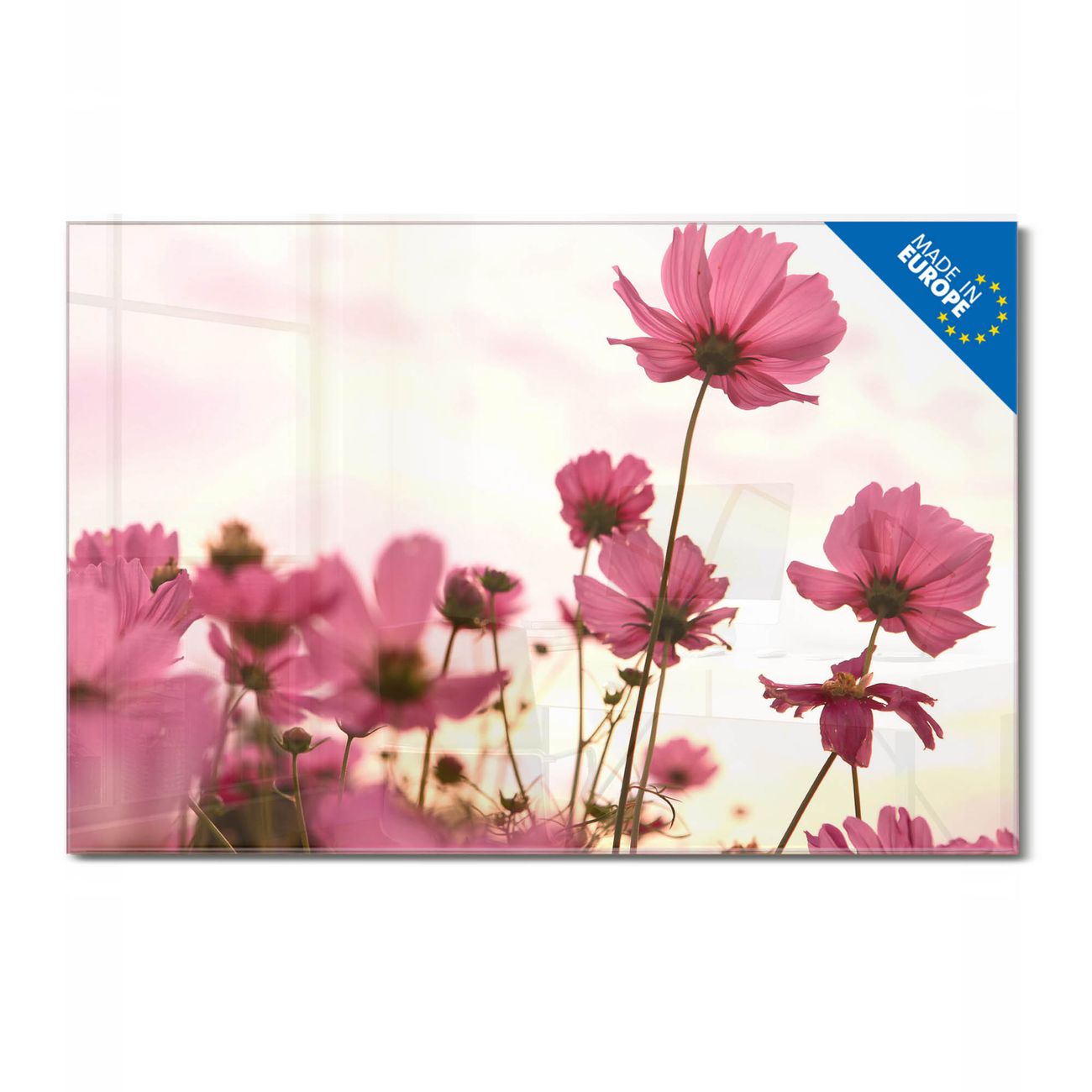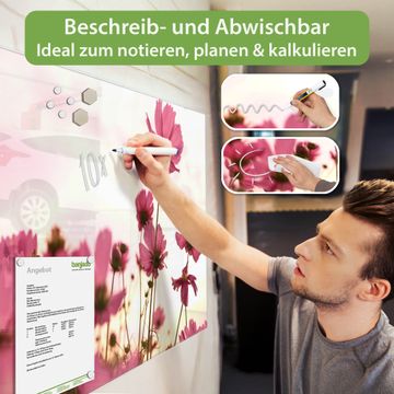 Material: 4mm Sicherheitsglas mit Metallrückwand Eigenschaften: beschreibbar, magnetisch, kratzfest Maße: 45x30x0,6cm, 2,03kg schwer Motiv Nummer 12257 Cosmea Zubehör: inklusive 4 Neodym-Magnete
