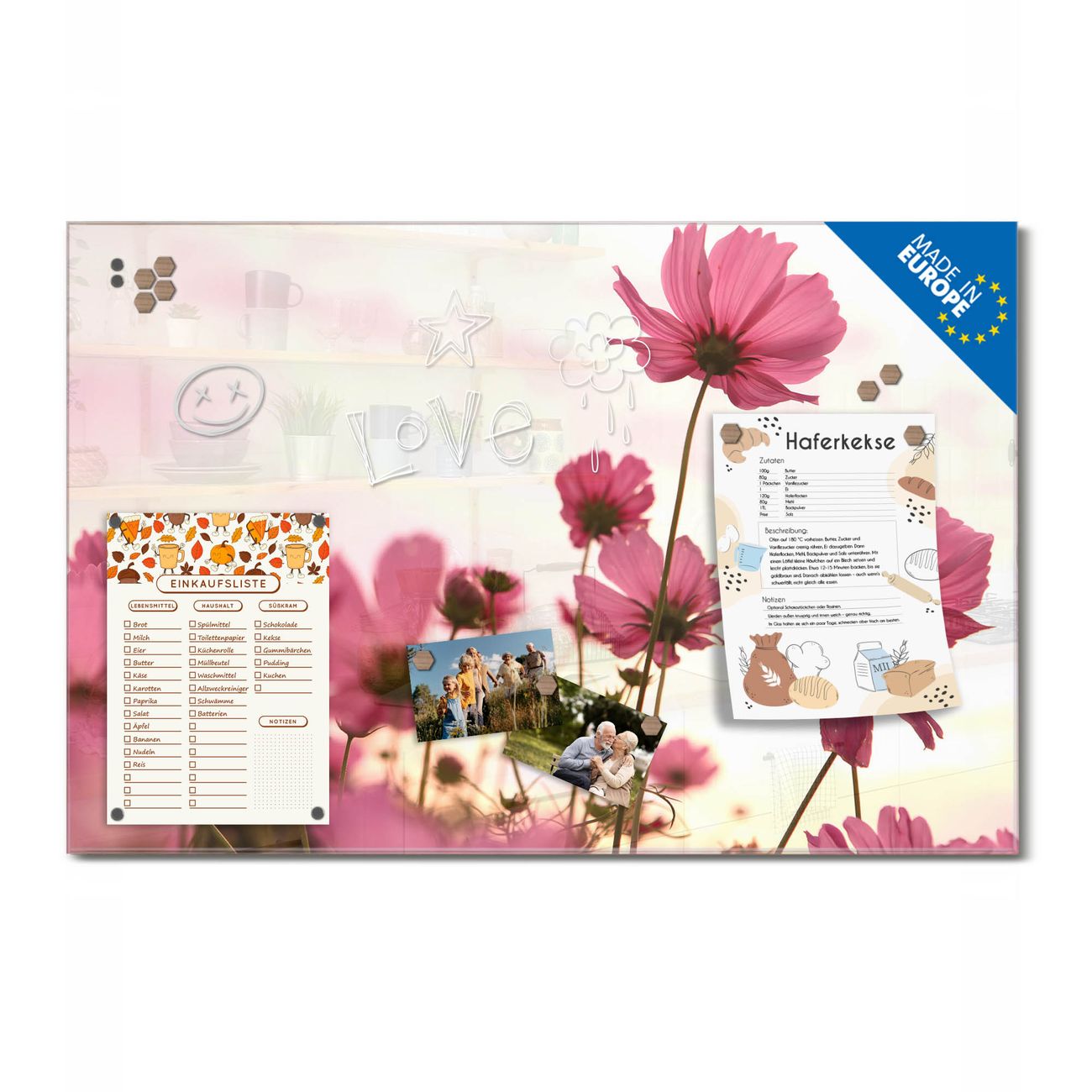 Ein Stück Design, das Ihren Alltag organisiert. Schreiben, heften, inspirieren - alles an einem Ort. Qualität, die man spürt. Montage leicht gemacht. Handwerk mit Herz - veredelt in Sachsen. Einzigartiges Design mit Motiv Motiv Cosmea Beschreibbare Glasoberfläche, leicht zu reinigen Starke Magnetkraft durch Stahlrückwand Inklusive 4 Neodym-Magneten Flexible Montageoptionen Handveredelt in Sachsen - Qualität, die bleibt