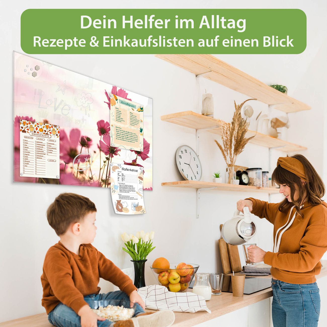 Auf der glatten Glasoberfläche lassen sich Termine, Rezepte oder Notizen ganz einfach mit Kreidestiften festhalten und rückstandslos entfernen. Starke Neodym-Magnete halten Ihre wichtigsten Erinnerungen sicher an Ort und Stelle. So entsteht Ihre ganz persönliche Ideenwand - jeden Tag neu.
