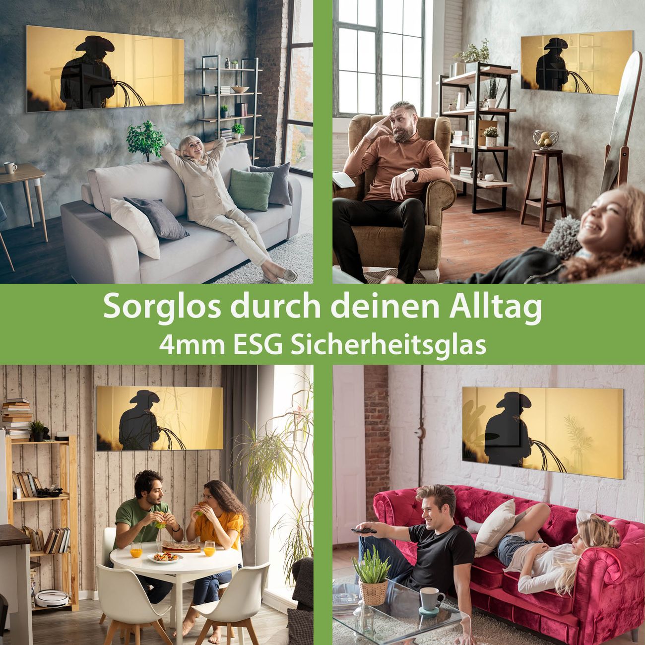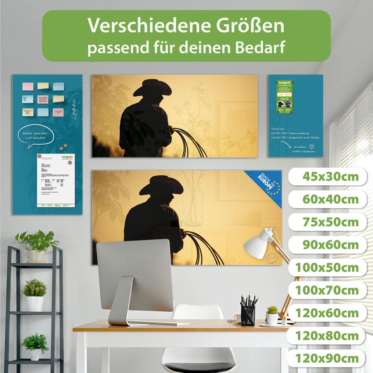 Material: 4mm Sicherheitsglas mit Metallrückwand Eigenschaften: beschreibbar, magnetisch, kratzfest Maße: 100x50x0,6cm, 7,50kg schwer Motiv Nummer 10295 Cowboy Zubehör: inklusive 4 Neodym-Magnete