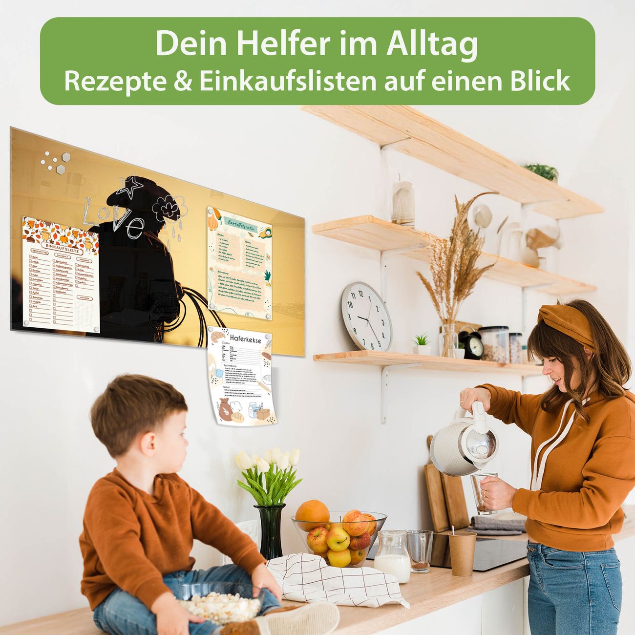 Auf der glatten Glasoberfläche lassen sich Termine, Rezepte oder Notizen ganz einfach mit Kreidestiften festhalten und rückstandslos entfernen. Starke Neodym-Magnete halten Ihre wichtigsten Erinnerungen sicher an Ort und Stelle. So entsteht Ihre ganz persönliche Ideenwand - jeden Tag neu.