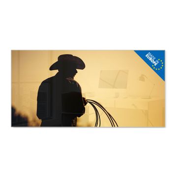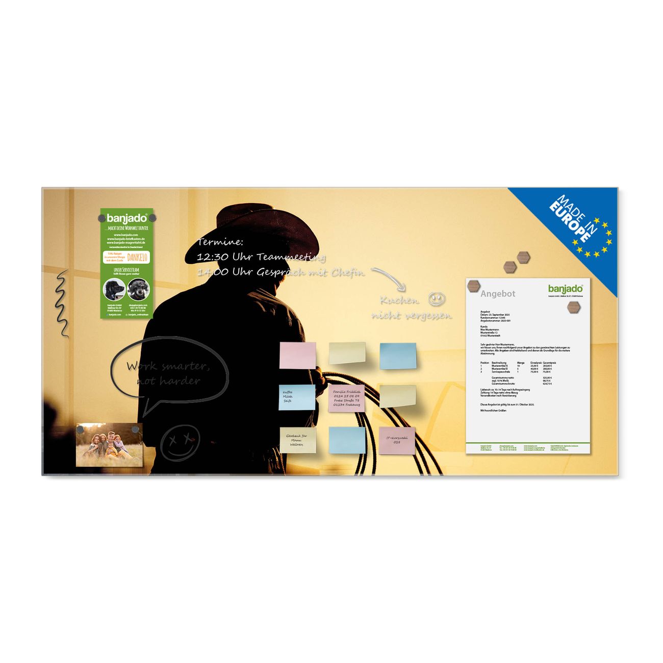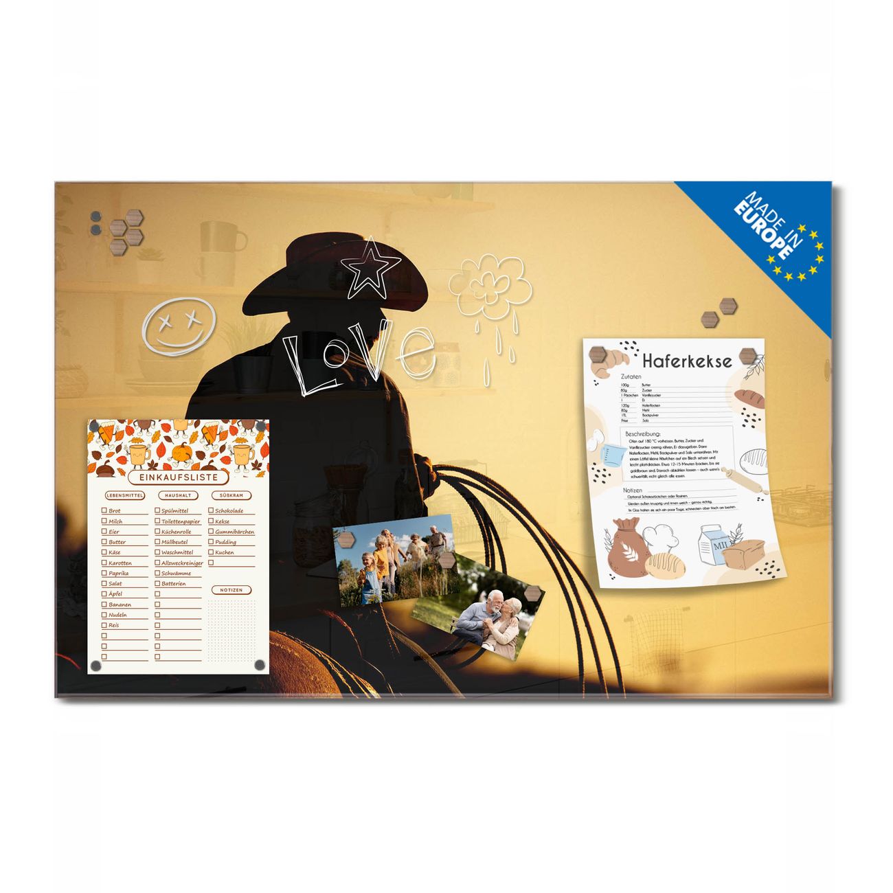 Material: 4mm Sicherheitsglas mit Metallrückwand Eigenschaften: beschreibbar, magnetisch, kratzfest Maße: 120x60x0,6cm, 10,80kg schwer Motiv Nummer 10295 Cowboy Zubehör: inklusive 4 Neodym-Magnete