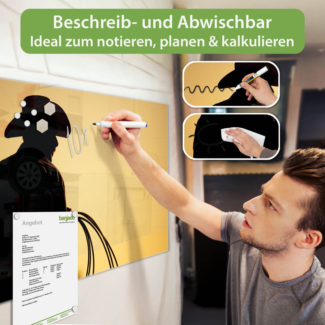 Jede Glas Magnettafel wird in unserer Werkstatt von Hand gefertigt und sorgfältig geprüft. So erhalten Sie ein echtes Qualitätsprodukt, das Funktion und Ästhetik perfekt vereint.?? Warum banjado?