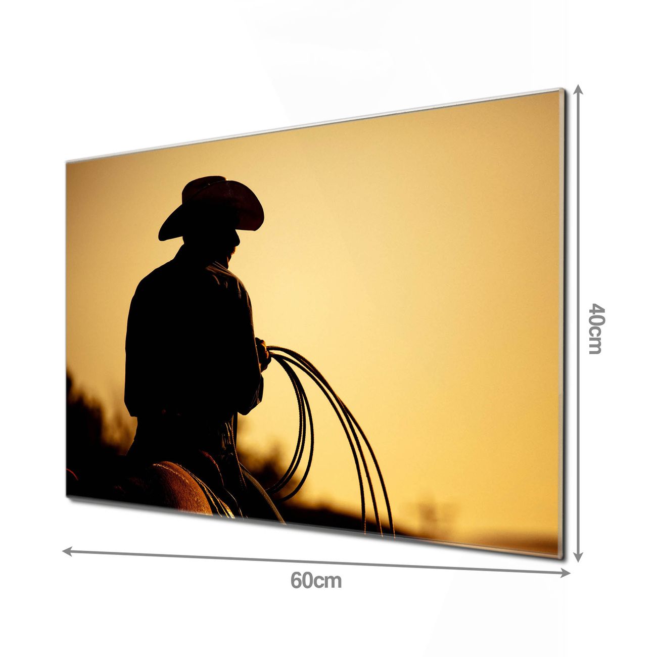 Material: 4mm Sicherheitsglas mit Metallrückwand Eigenschaften: beschreibbar, magnetisch, kratzfest Maße: 60x40x0,6cm, 3,6kg schwer Motiv Nummer 10295 Cowboy Zubehör: inklusive 4 Neodym-Magnete