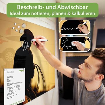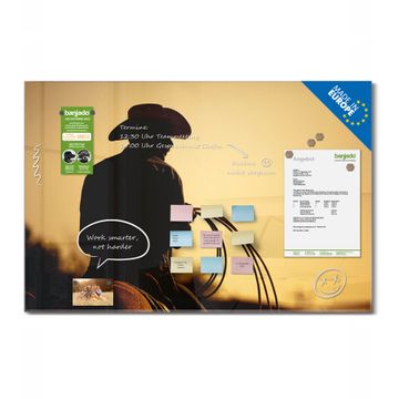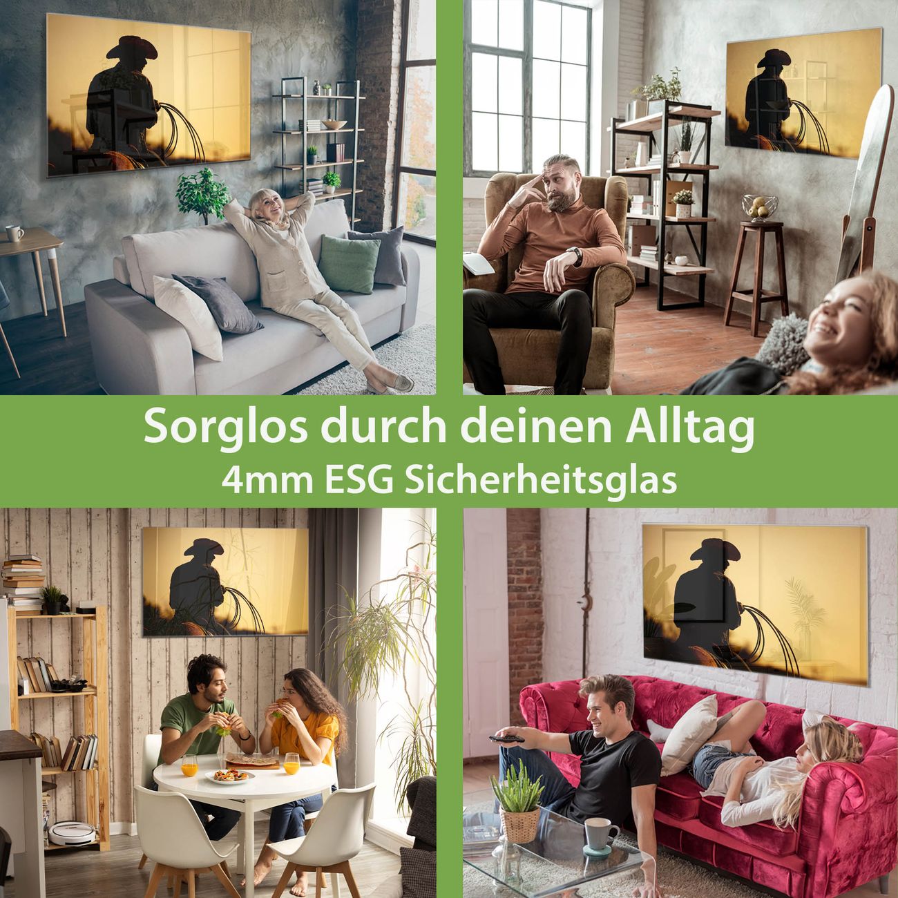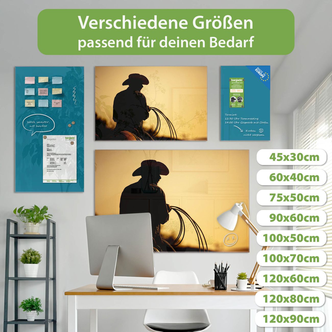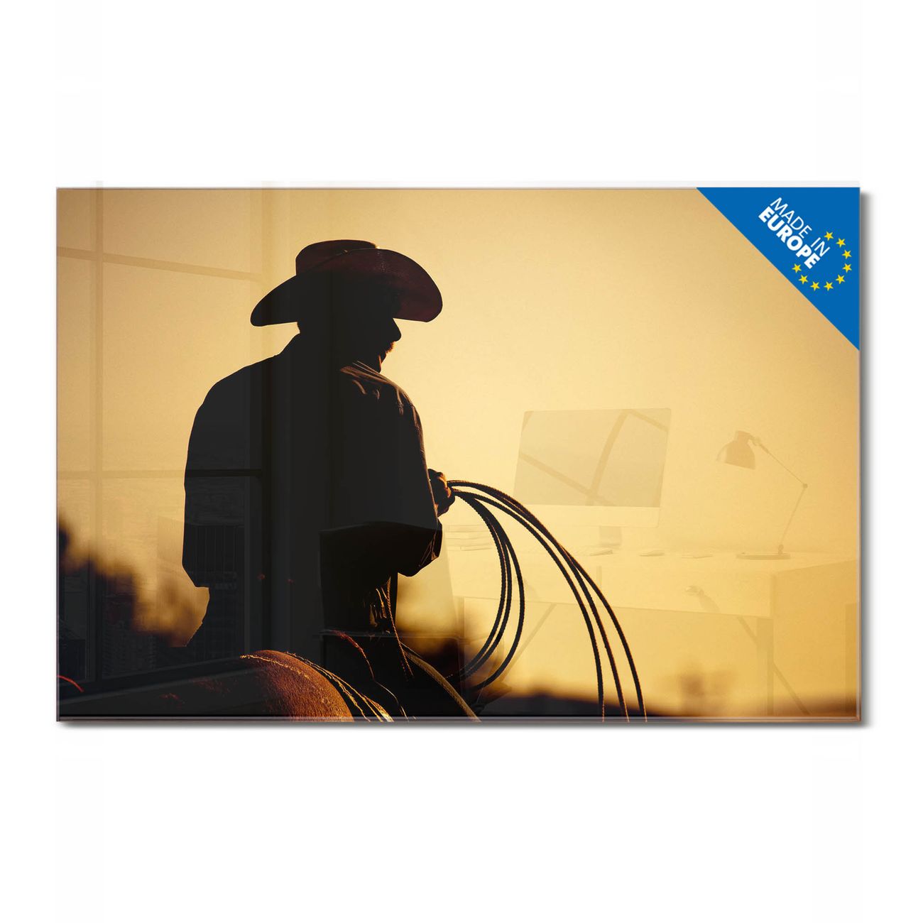 Material: 4mm Sicherheitsglas mit Metallrückwand Eigenschaften: beschreibbar, magnetisch, kratzfest Maße: 90x60x0,6cm, 8,10kg schwer Motiv Nummer 10295 Cowboy Zubehör: inklusive 4 Neodym-Magnete