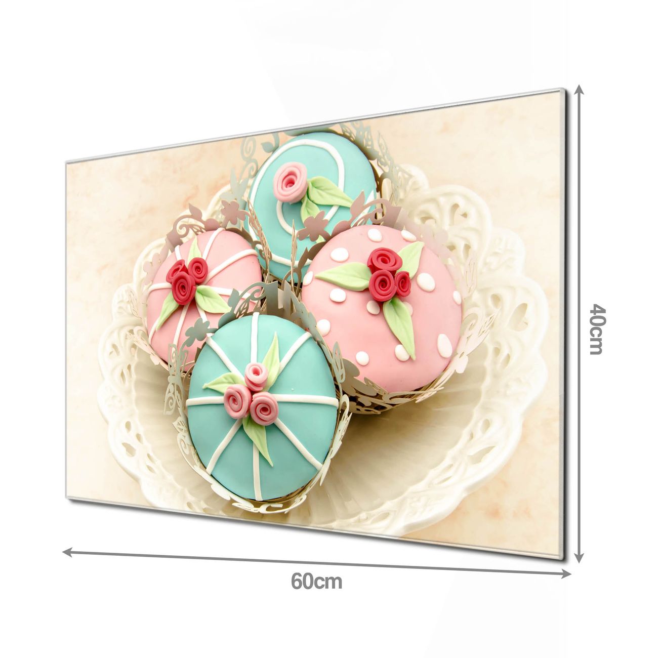 Material  4mm Sicherheitsglas mit Metallrückwand Eigenschaften  beschreibbar, magnetisch, kratzfest Maße  60x40x0,6cm, 3,6kg schwer Motiv  Nummer 10544 Cupcakes Zubehör  inklusive 4 Neodym-Magnete
