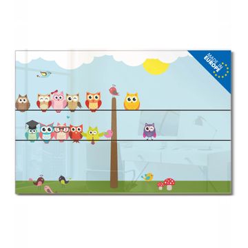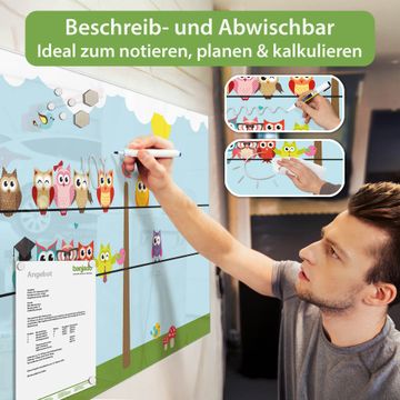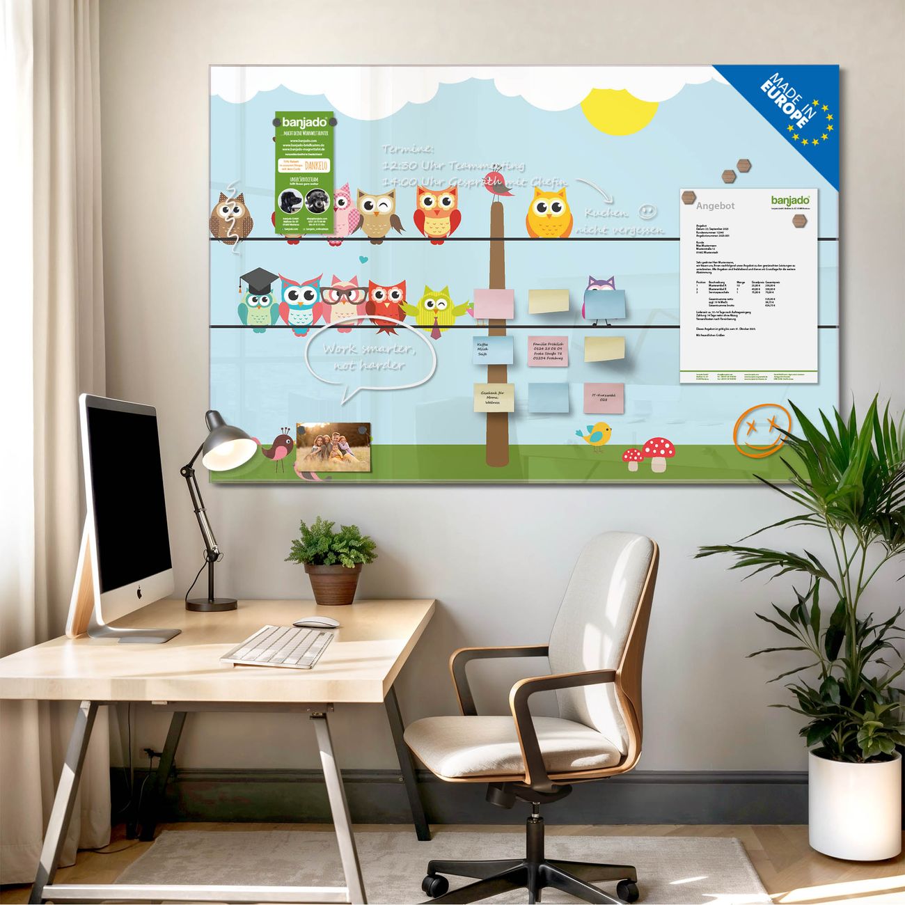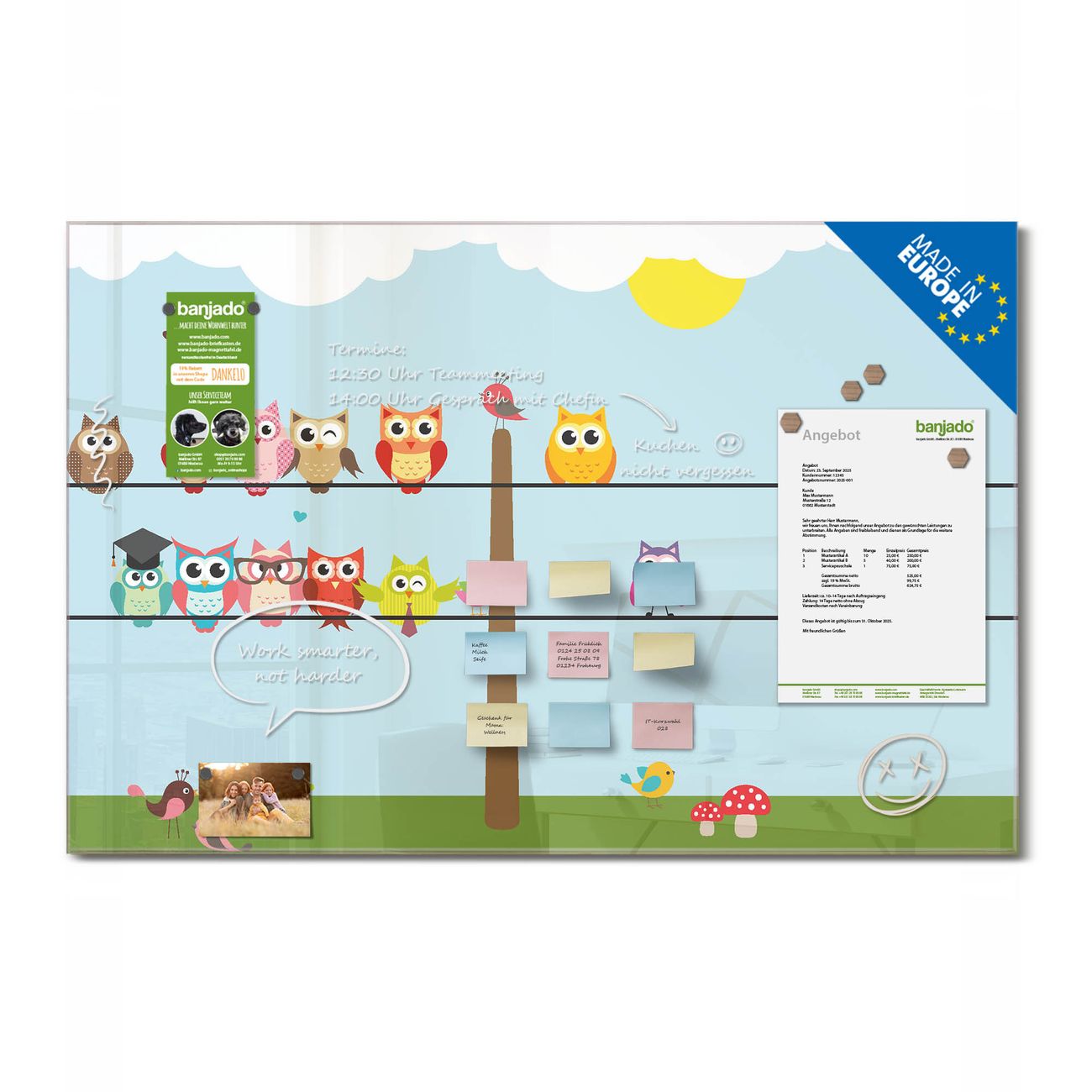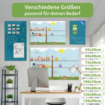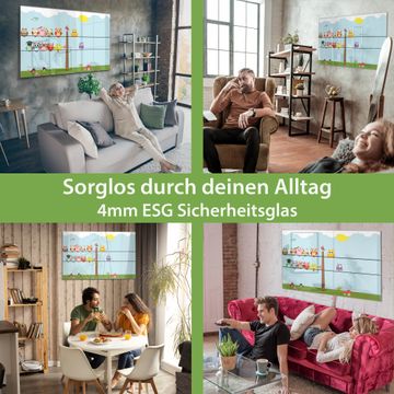 Material: 4mm Sicherheitsglas mit Metallrückwand Eigenschaften: beschreibbar, magnetisch, kratzfest Maße: 90x60x0,6cm, 8,10kg schwer Motiv Nummer 11458 Da Wären Wir Zubehör: inklusive 4 Neodym-Magnete
