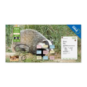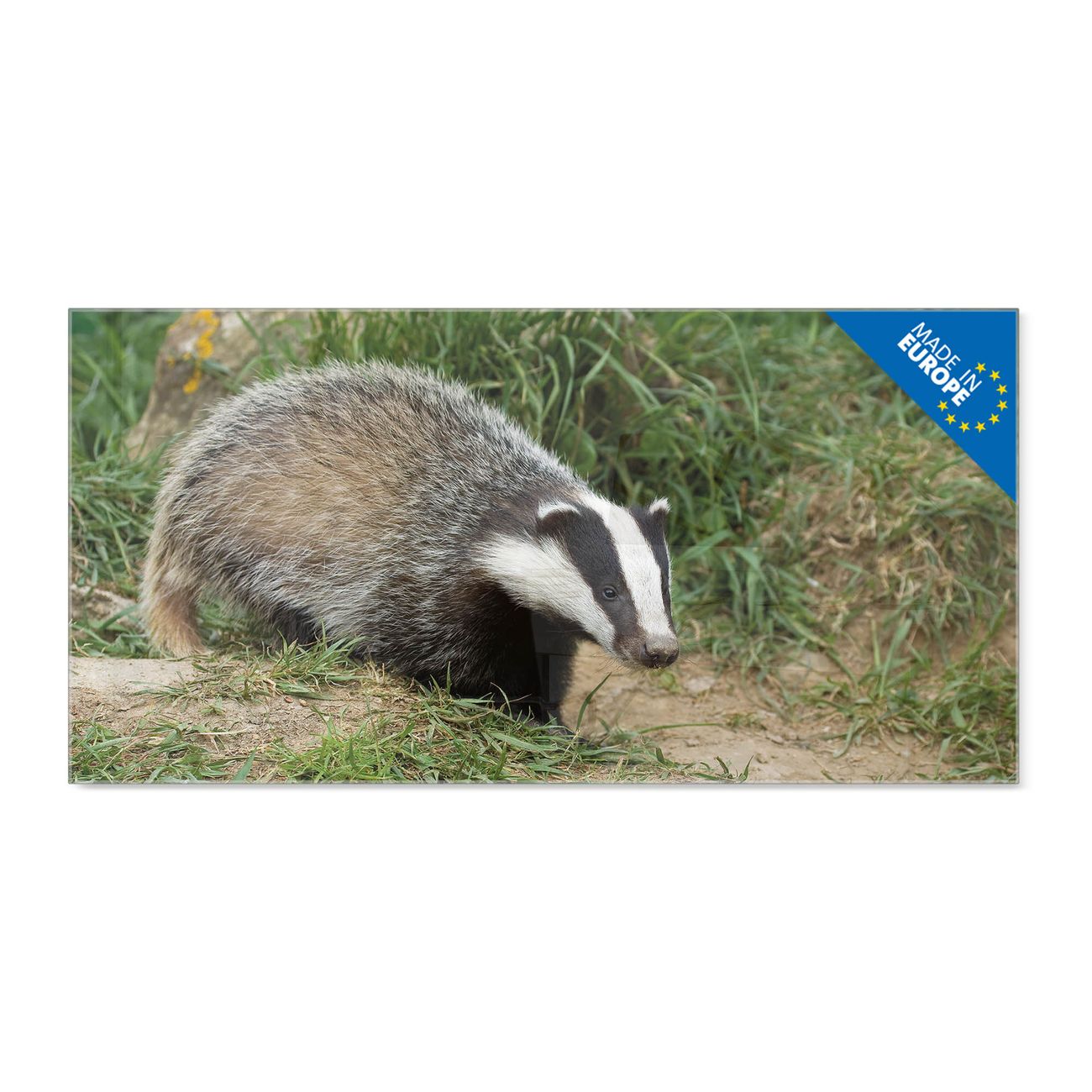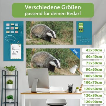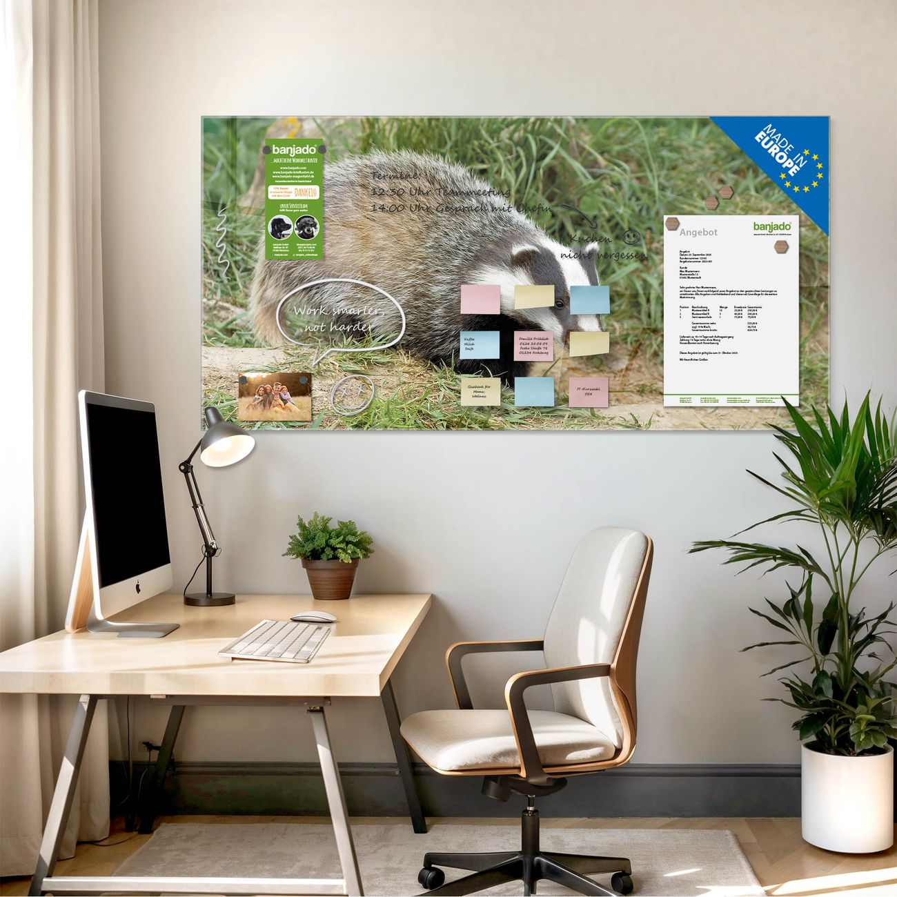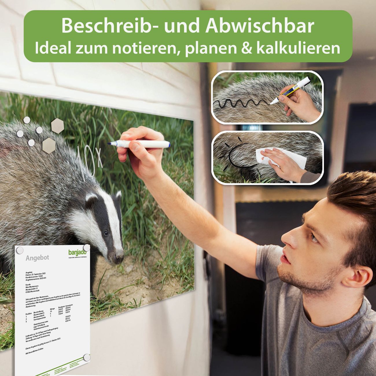 Material: 4mm Sicherheitsglas mit Metallrückwand Eigenschaften: beschreibbar, magnetisch, kratzfest Maße: 100x50x0,6cm, 7,50kg schwer Motiv Nummer 10486 Dachs Zubehör: inklusive 4 Neodym-Magnete