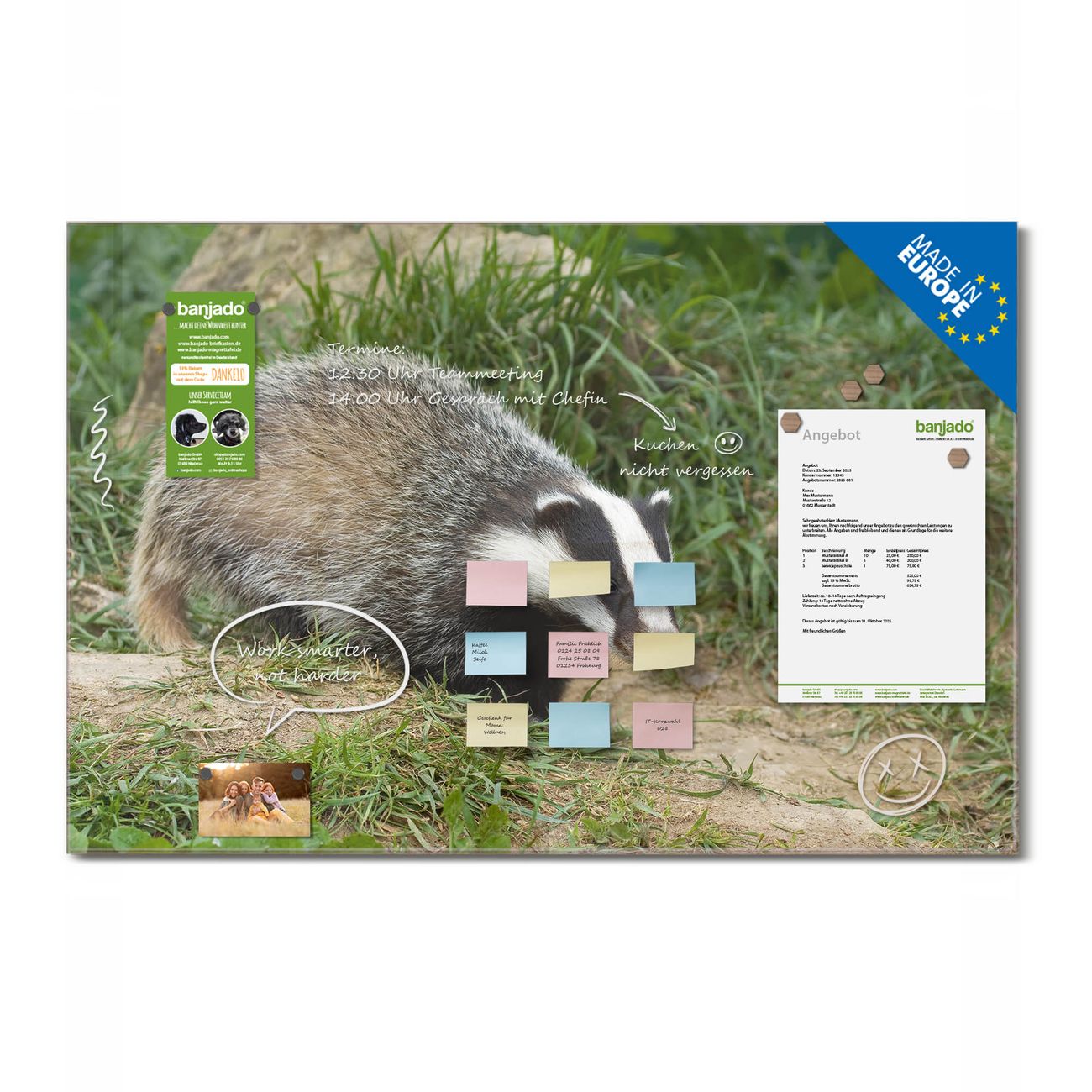 Material: 4mm Sicherheitsglas mit Metallrückwand Eigenschaften: beschreibbar, magnetisch, kratzfest Maße: 120x80x0,6cm, 14,40kg schwer Motiv Nummer 10486 Dachs Zubehör: inklusive 4 Neodym-Magnete