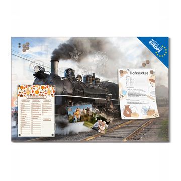 Material: 4mm Sicherheitsglas mit Metallrückwand Eigenschaften: beschreibbar, magnetisch, kratzfest Maße: 75x50x0,6cm, 5,63kg schwer Motiv Nummer 10131 Dampflok Zubehör: inklusive 4 Neodym-Magnete