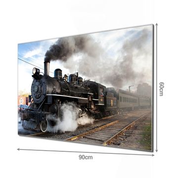 Material: 4mm Sicherheitsglas mit Metallrückwand Eigenschaften: beschreibbar, magnetisch, kratzfest Maße: 90x60x0,6cm, 8,10kg schwer Motiv Nummer 10131 Dampflok Zubehör: inklusive 4 Neodym-Magnete