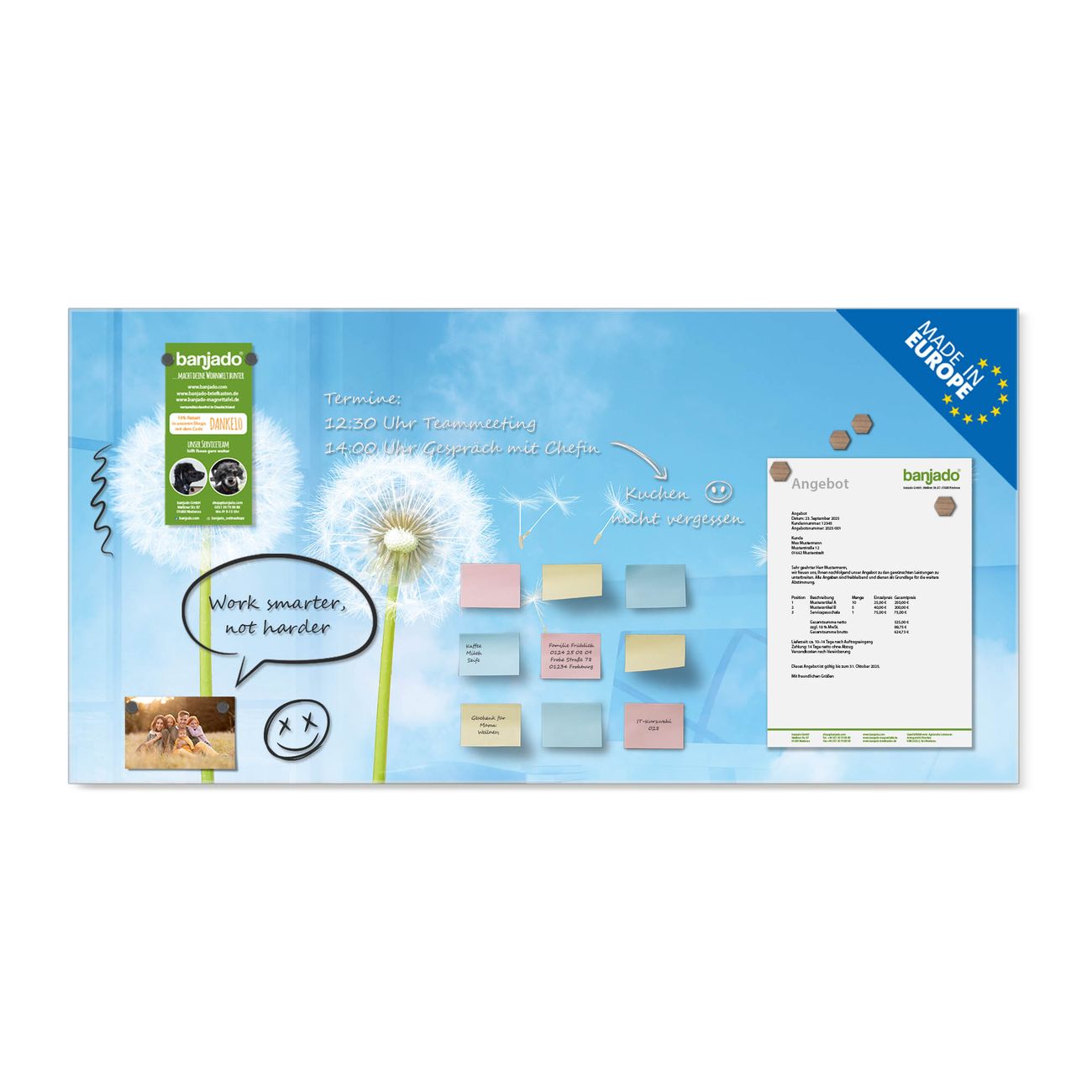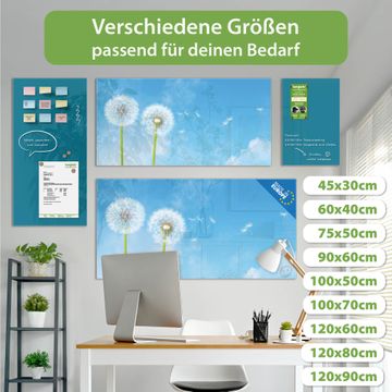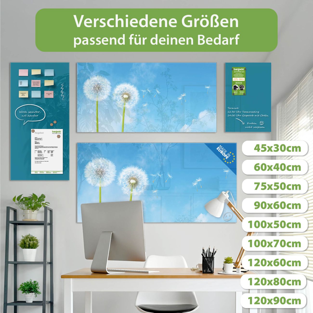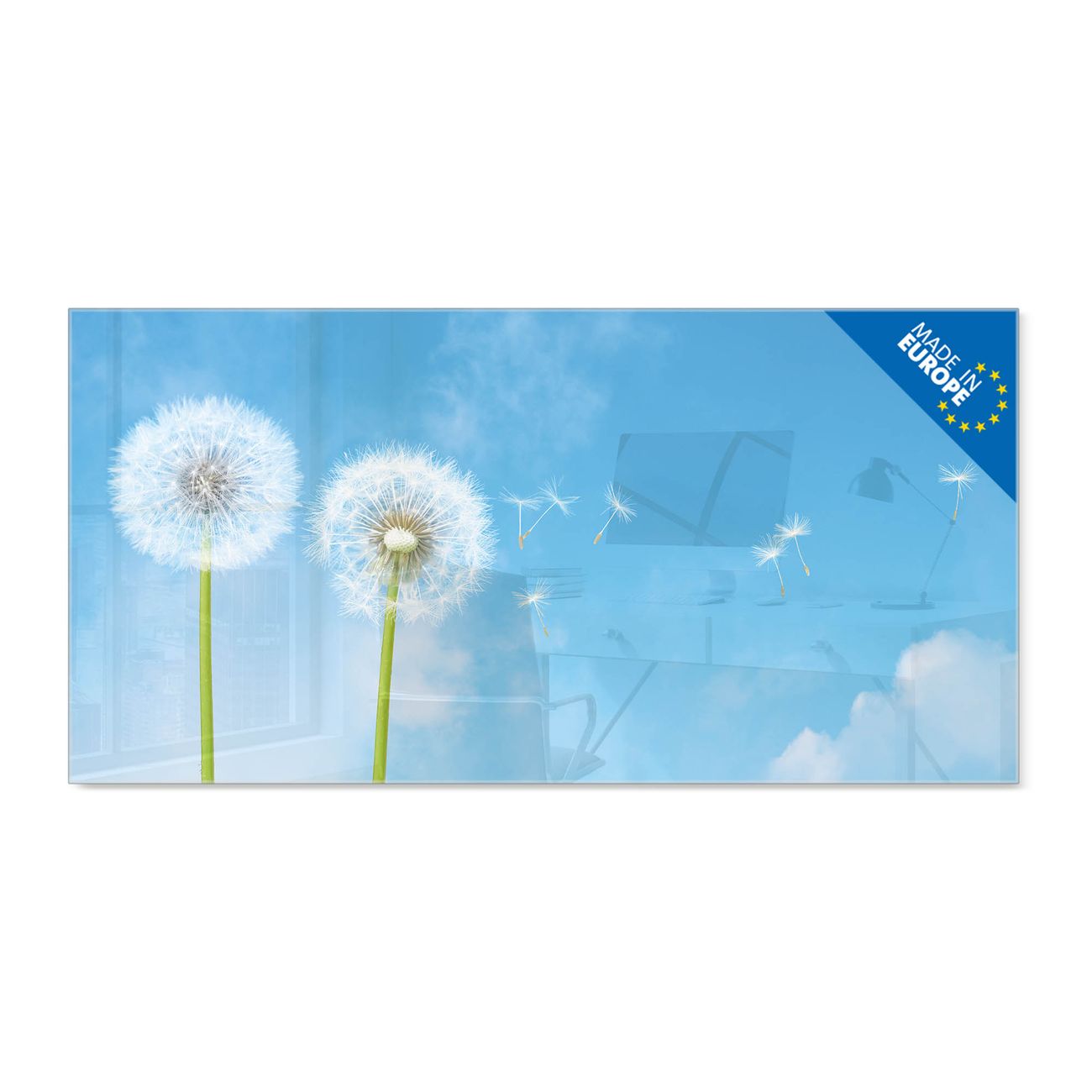 Material: 4mm Sicherheitsglas mit Metallrückwand Eigenschaften: beschreibbar, magnetisch, kratzfest Maße: 120x60x0,6cm, 10,80kg schwer Motiv Nummer 10174 Dandelion Zubehör: inklusive 4 Neodym-Magnete