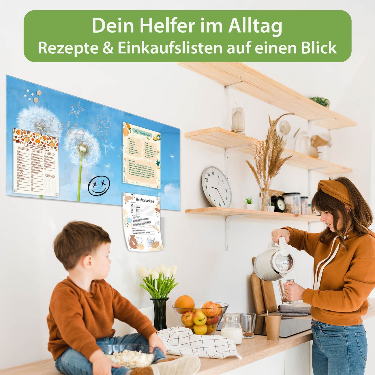 Ein Stück Design, das Ihren Alltag organisiert. Schreiben, heften, inspirieren - alles an einem Ort. Qualität, die man spürt. Montage leicht gemacht. Handwerk mit Herz - veredelt in Sachsen. Einzigartiges Design mit Motiv Motiv Dandelion Beschreibbare Glasoberfläche, leicht zu reinigen Starke Magnetkraft durch Stahlrückwand Inklusive 4 Neodym-Magneten Flexible Montageoptionen Handveredelt in Sachsen - Qualität, die bleibt