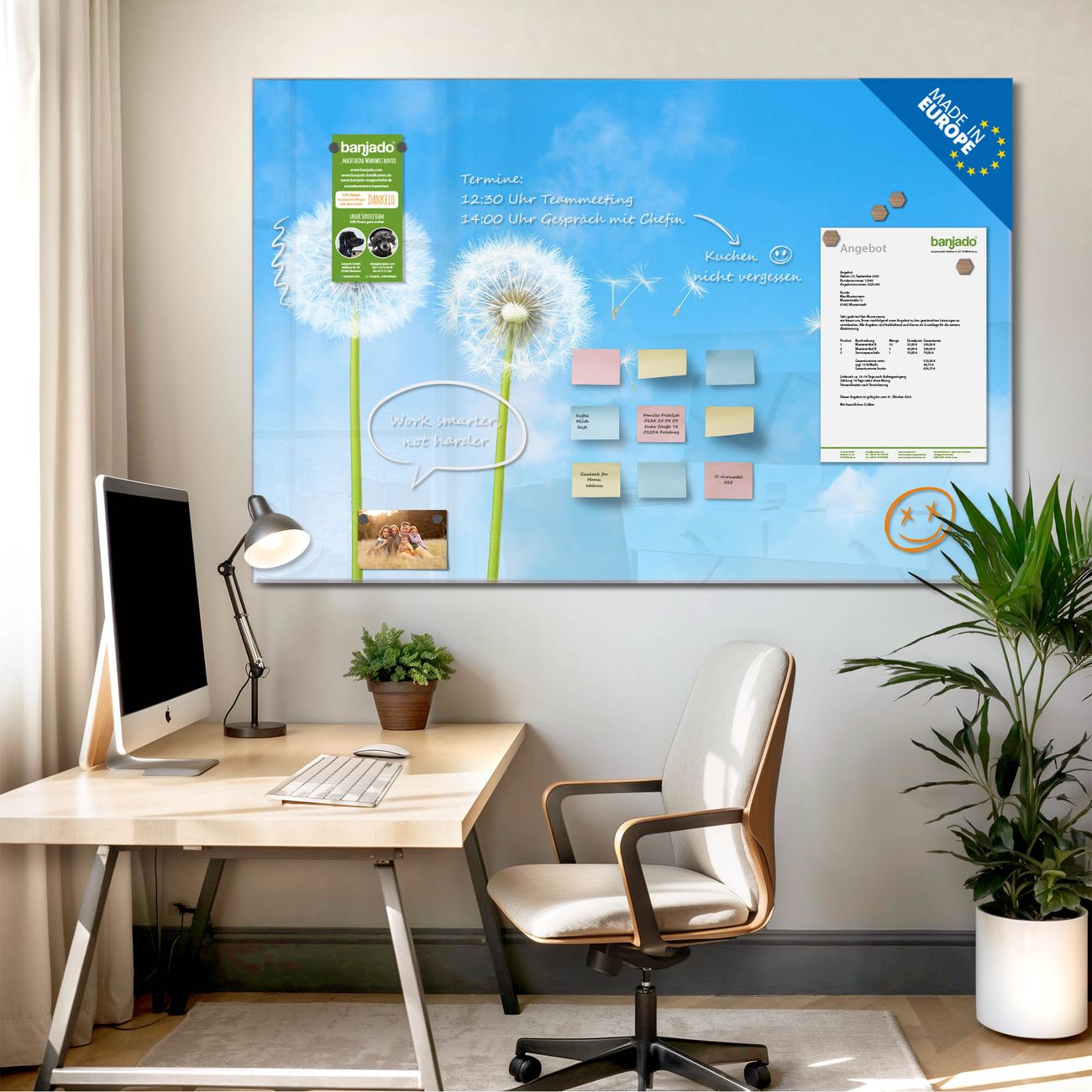 Jede Glas Magnettafel wird in unserer Werkstatt von Hand gefertigt und sorgfältig geprüft. So erhalten Sie ein echtes Qualitätsprodukt, das Funktion und Ästhetik perfekt vereint.?? Warum banjado?