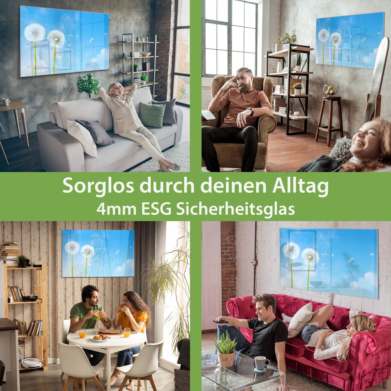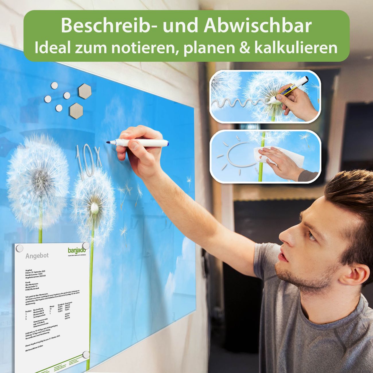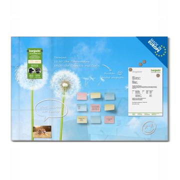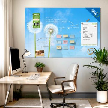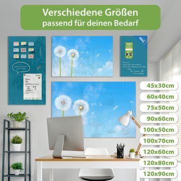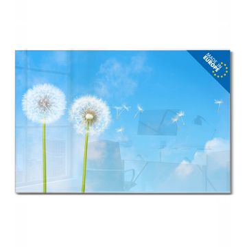 Material: 4mm Sicherheitsglas mit Metallrückwand Eigenschaften: beschreibbar, magnetisch, kratzfest Maße: 90x60x0,6cm, 8,10kg schwer Motiv Nummer 10174 Dandelion Zubehör: inklusive 4 Neodym-Magnete