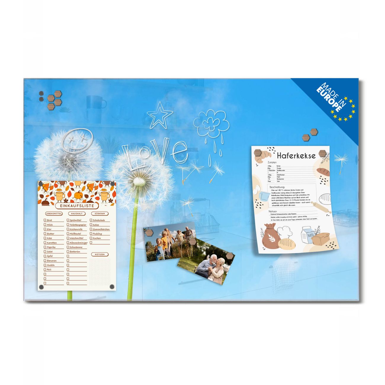 Material: 4mm Sicherheitsglas mit Metallrückwand Eigenschaften: beschreibbar, magnetisch, kratzfest Maße: 45x30x0,6cm, 2,03kg schwer Motiv Nummer 10174 Dandelion Zubehör: inklusive 4 Neodym-Magnete